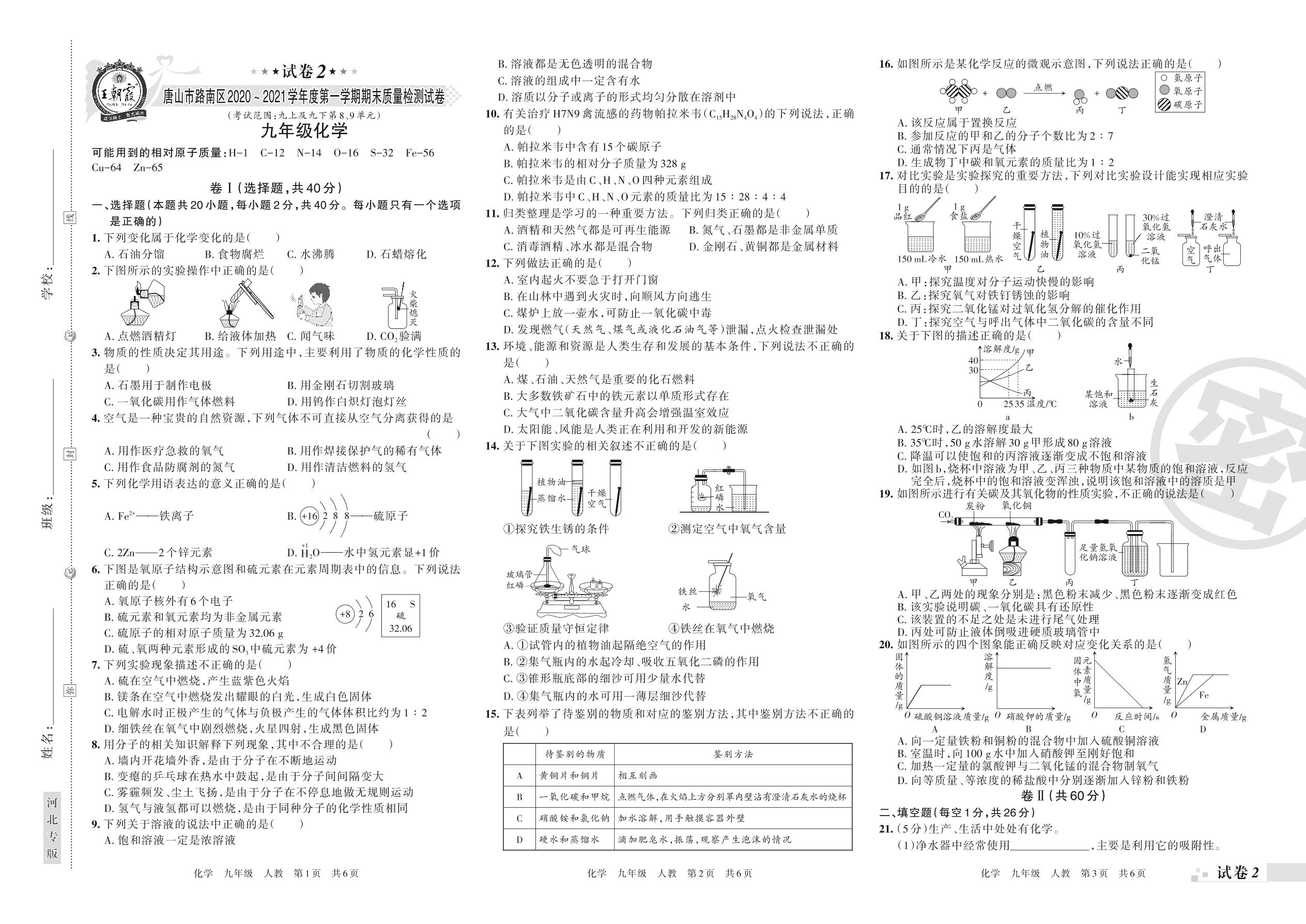 唐山市路南区2020~2021学年度第一学期期末质量检测试卷九年级化学(人教版)【2】