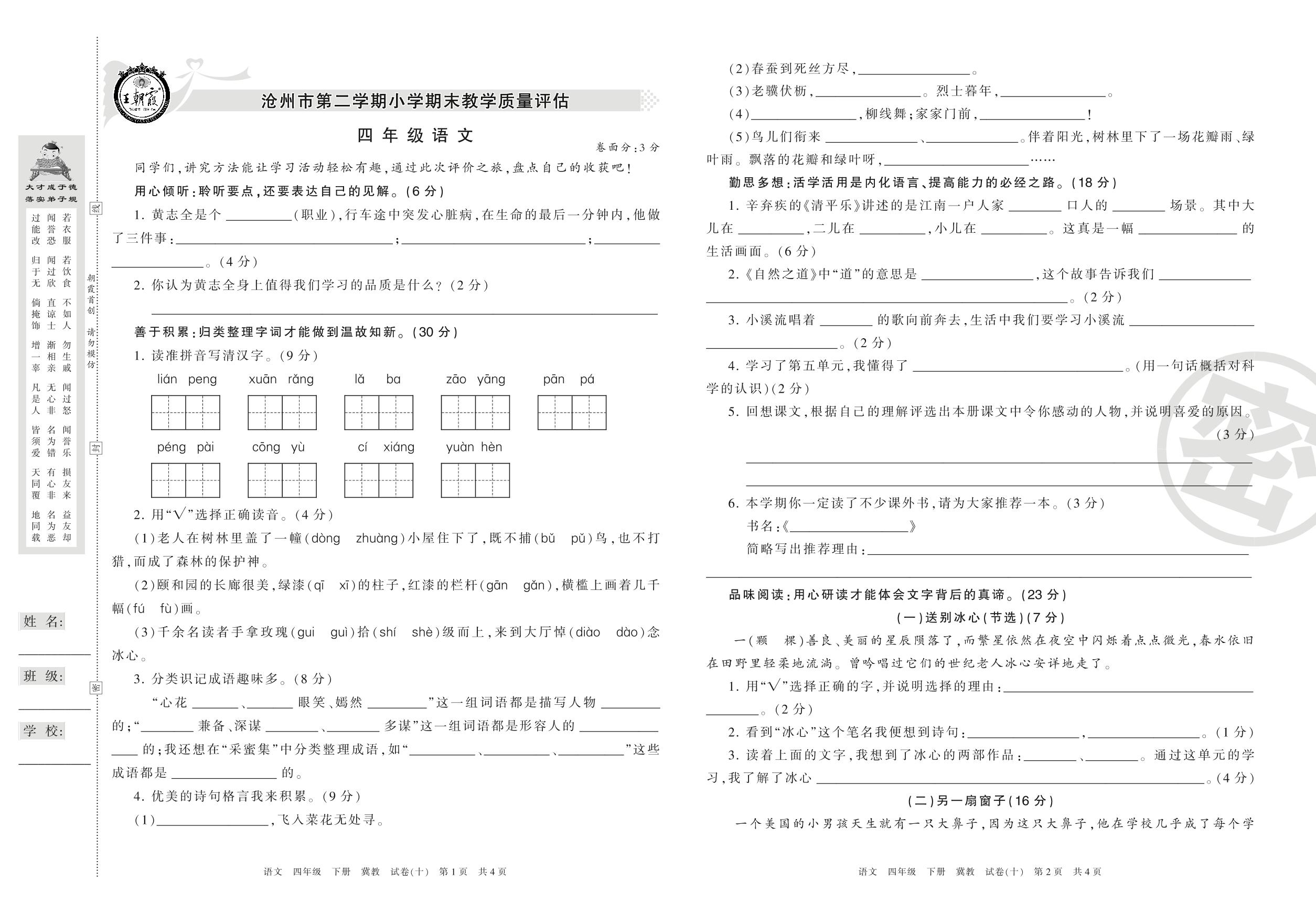 2015-2016学年第二学期沧州市四年级语文试卷(冀教版)【10】
