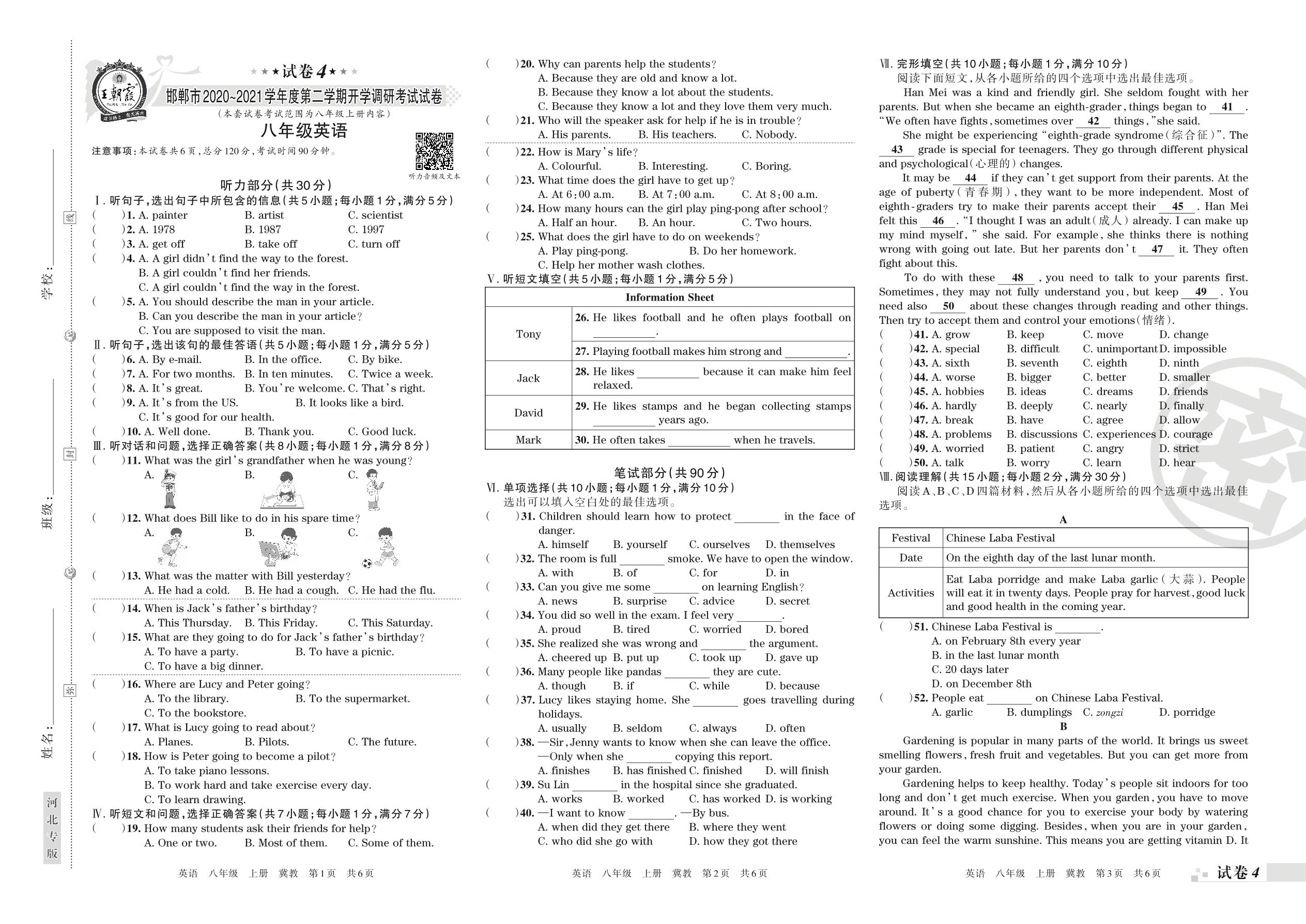 邯郸市2020~2021学年度第二学期开学调研考试八年级英语(冀教版)【4】