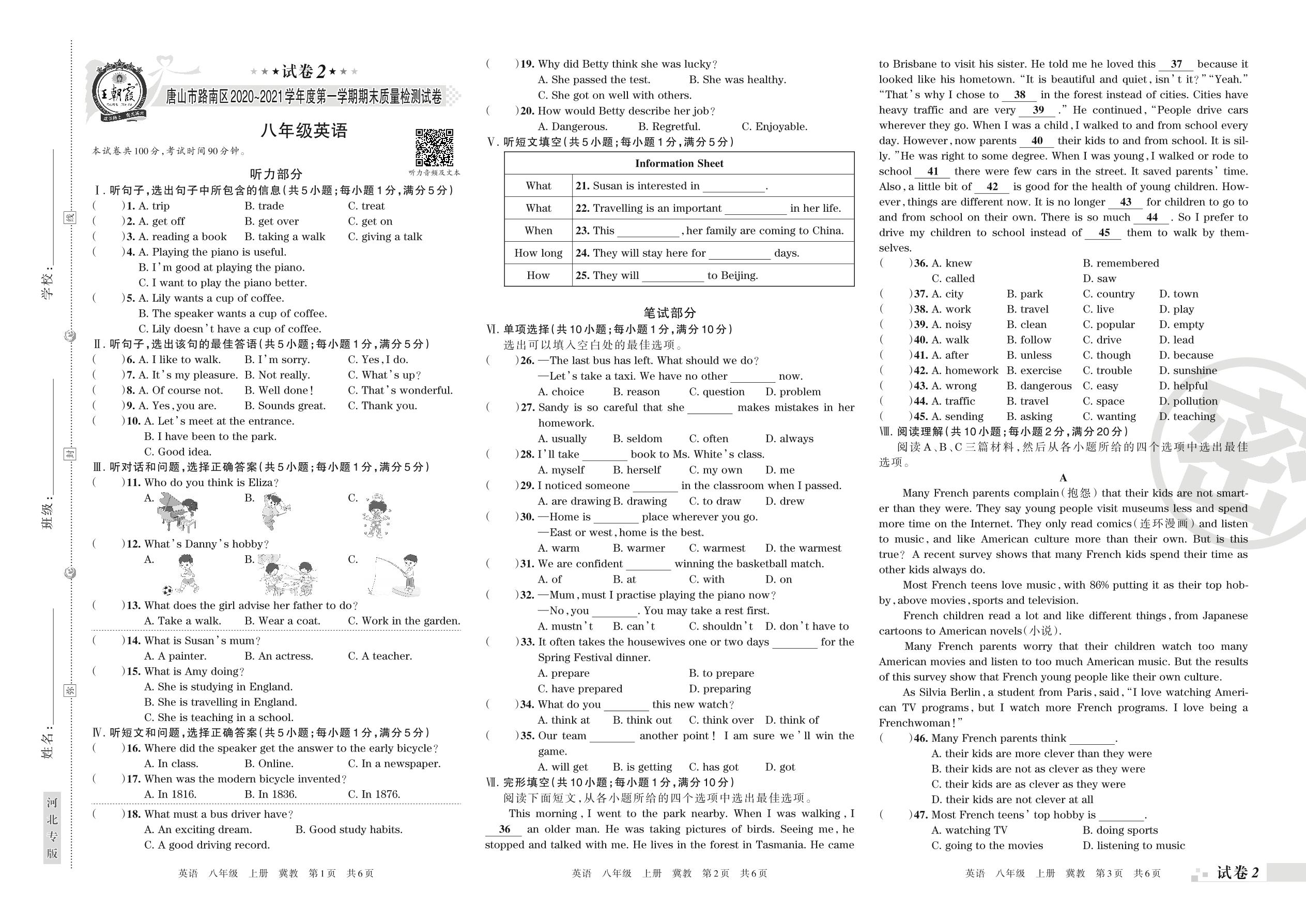 唐山市路南区2020~2021学年度第一学期期末质量检测八年级英语(冀教版)【2】