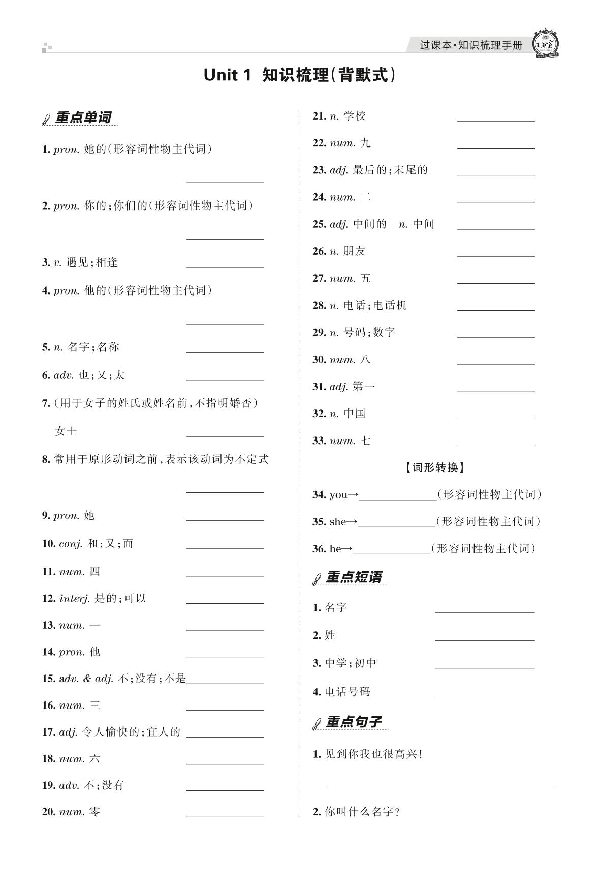 王朝霞期末过课本——Unit 1 知识梳理(背默式)七年级上册英语(人教版)【2】