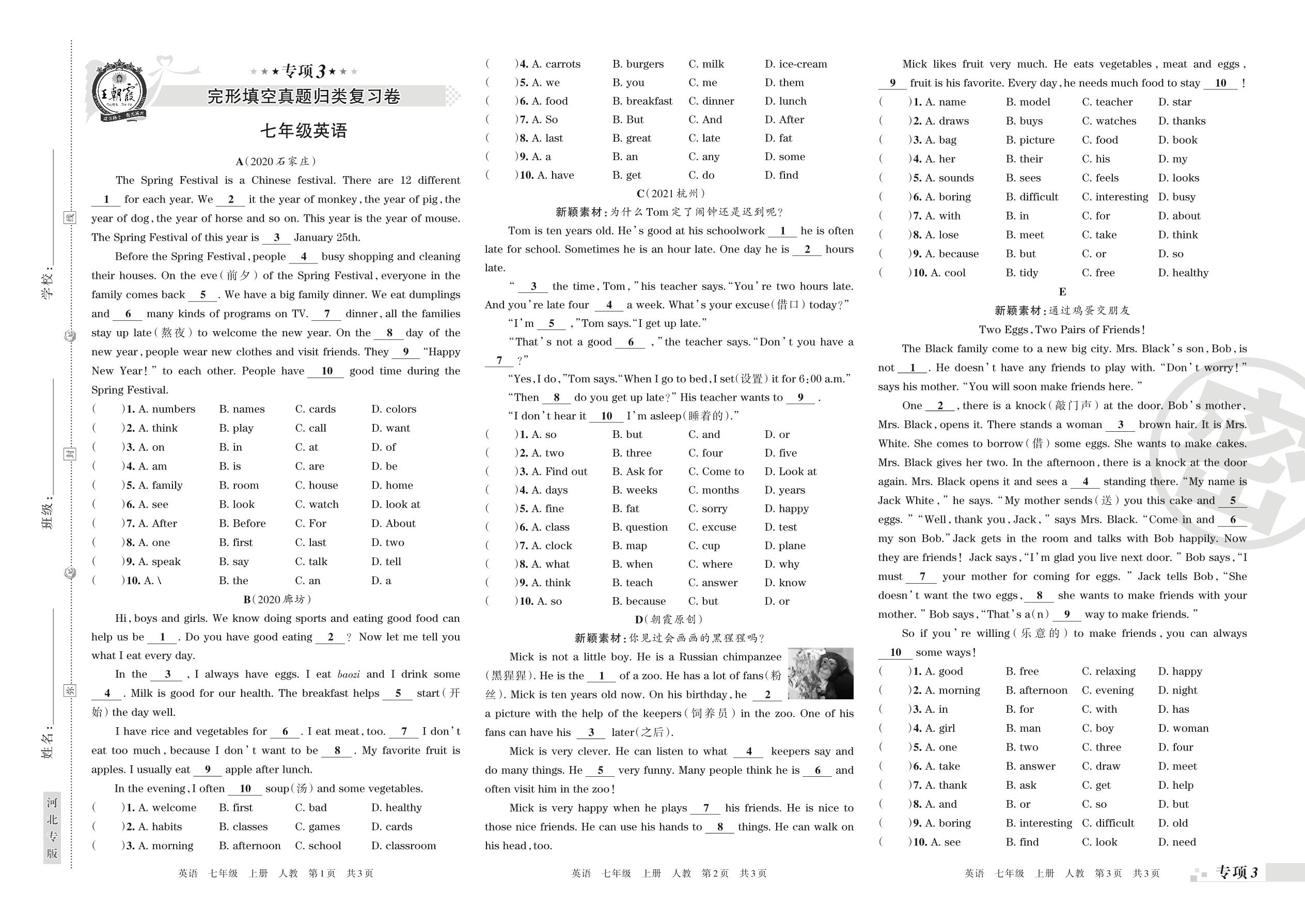 王朝霞期末专项卷——完形填空真题归类复习卷七年级上册英语(人教版)_R211127111656803【3】