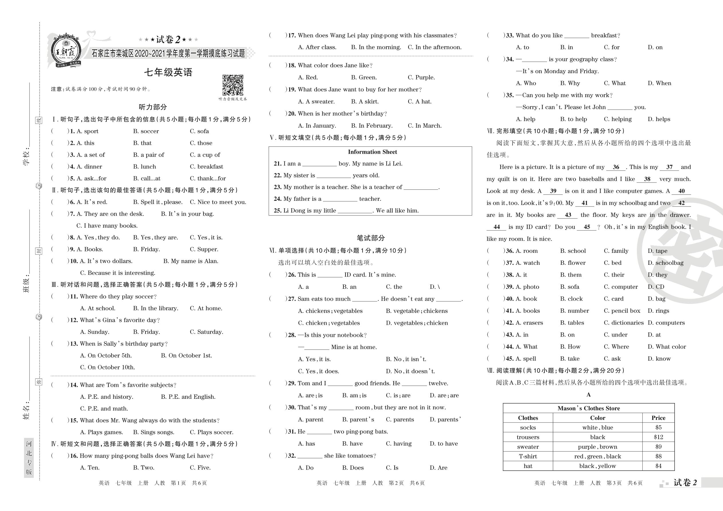 石家庄市栾城区2020~2021学年度第一学期摸底练习试题七年级英语(人教版)【2】
