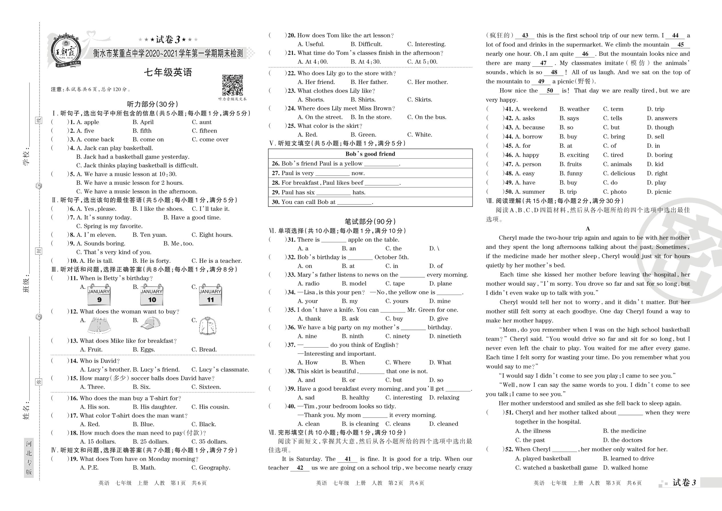 衡水市某重点中学2020~2021学年第一学期期末检测七年级英语(人教版)【3】