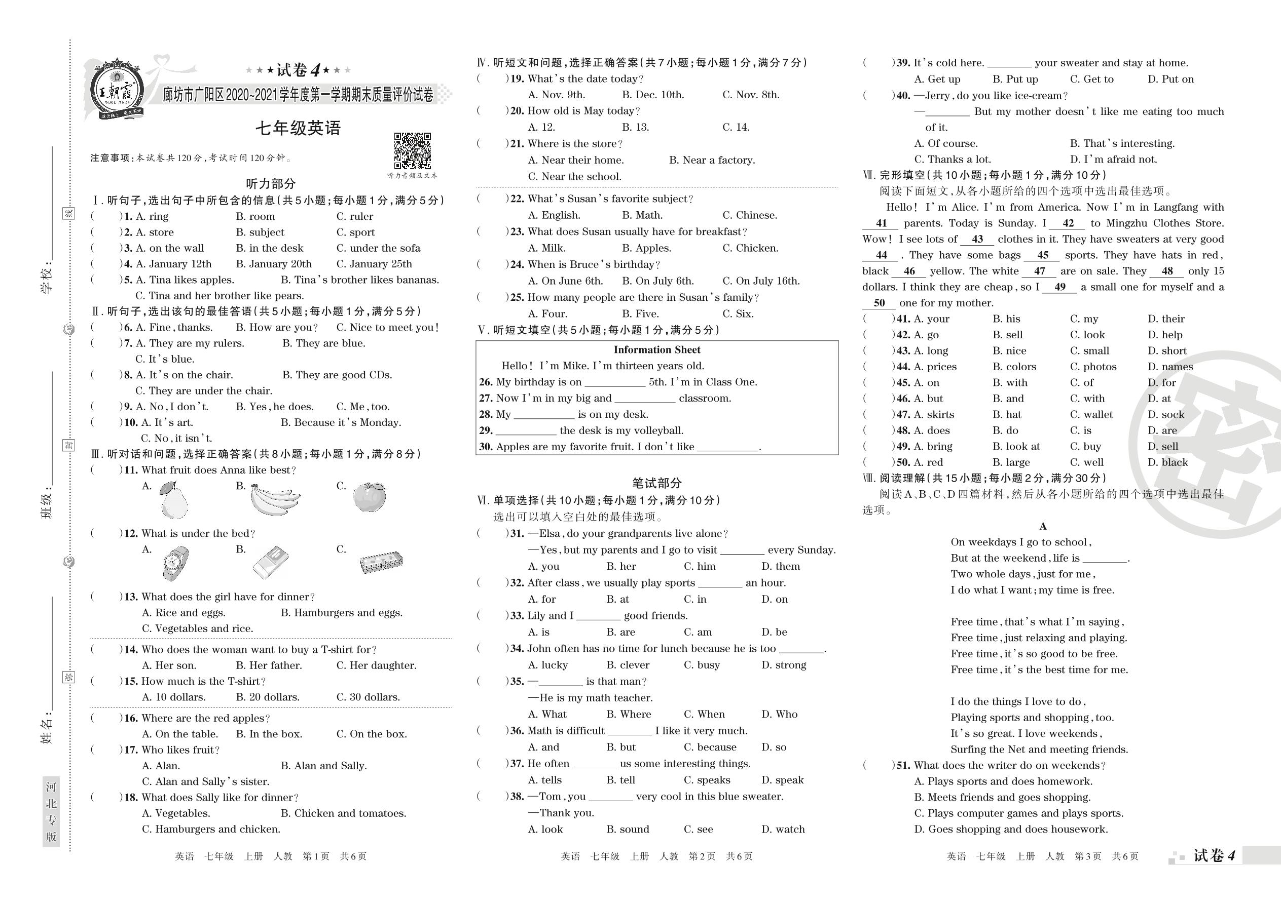 廊坊市广阳区2020~2021学年度第一学期期末质量评价七年级英语(人教版)【4】