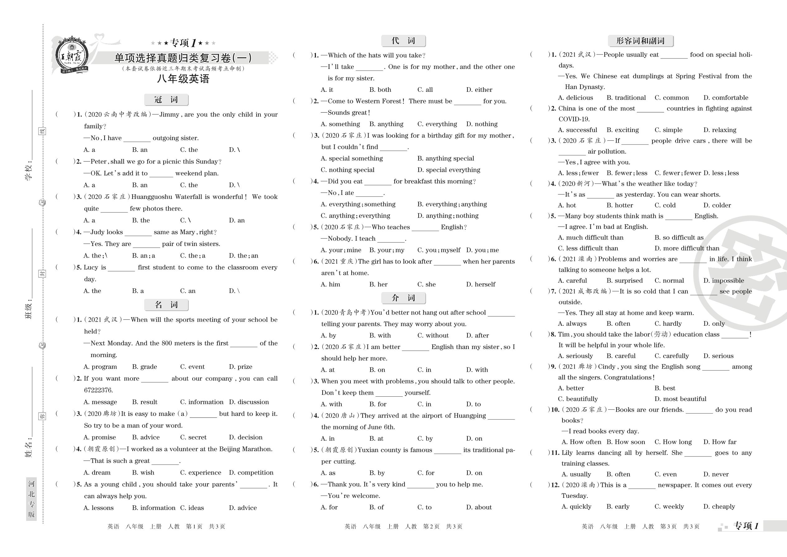 王朝霞期末专项卷——单项选择真题归类复习卷(一)八年级上册英语(人教版)【1】
