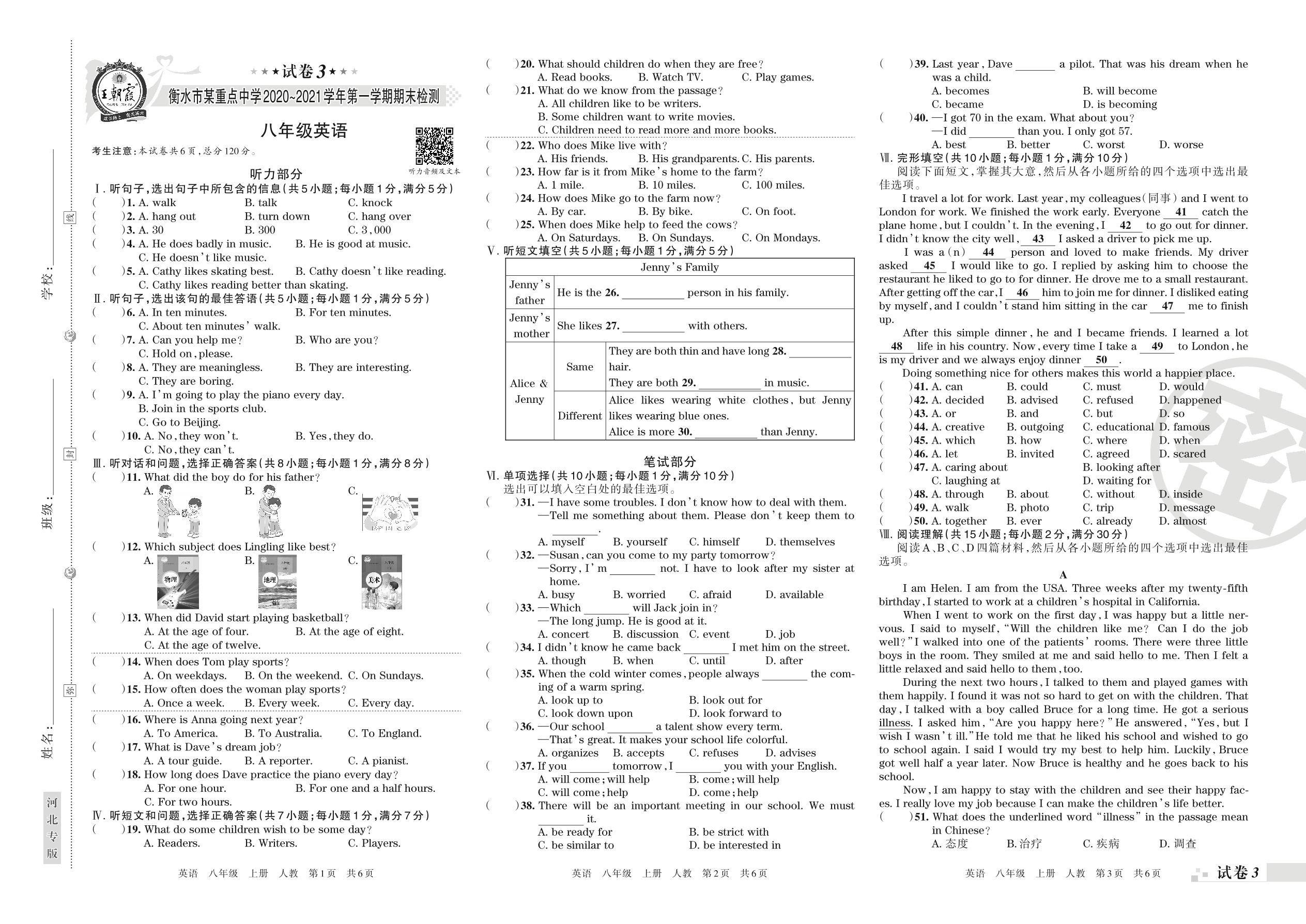 衡水市某重点中学2020~2021学年第一学期期末检测八年级英语(人教版)【3】