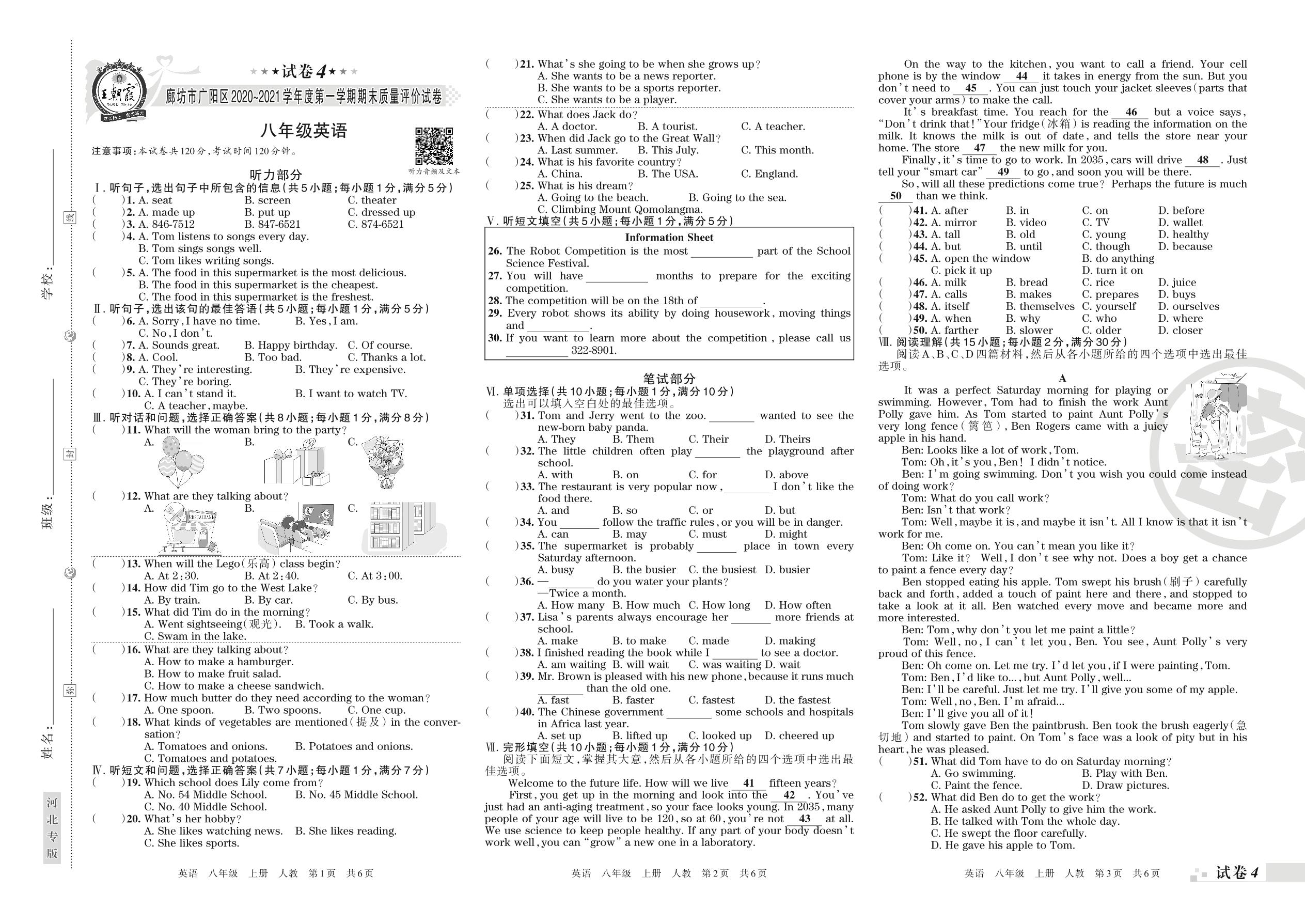 廊坊市广阳区2020~2021学年度第一学期期末质量评价八年级英语(人教版)【4】