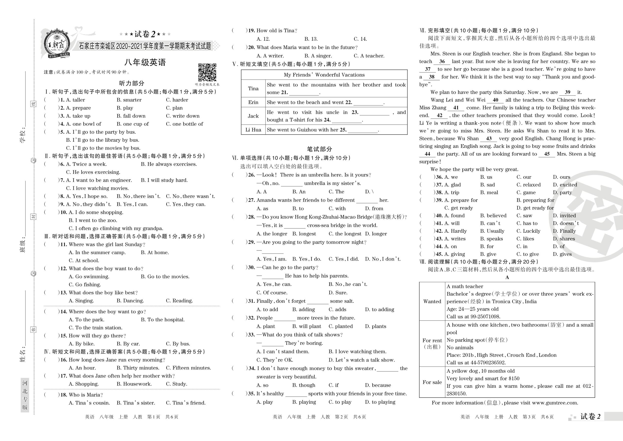 石家庄市栾城区2020~2021学年度第一学期期末考试试题八年级英语(人教版)【2】