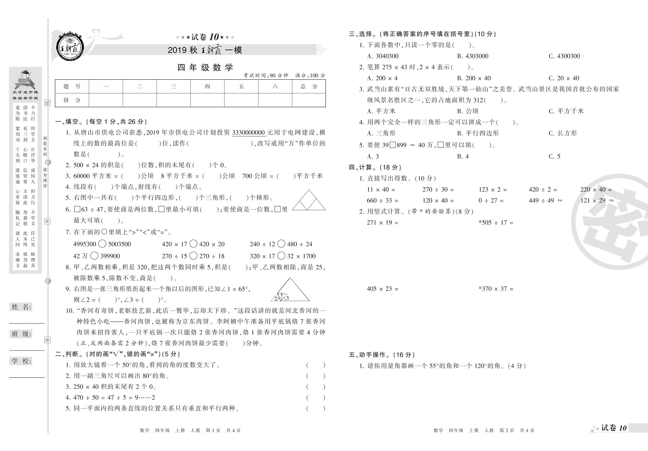 王朝霞期末模拟卷四年级上册数学(人教版)_R210804100102【10】