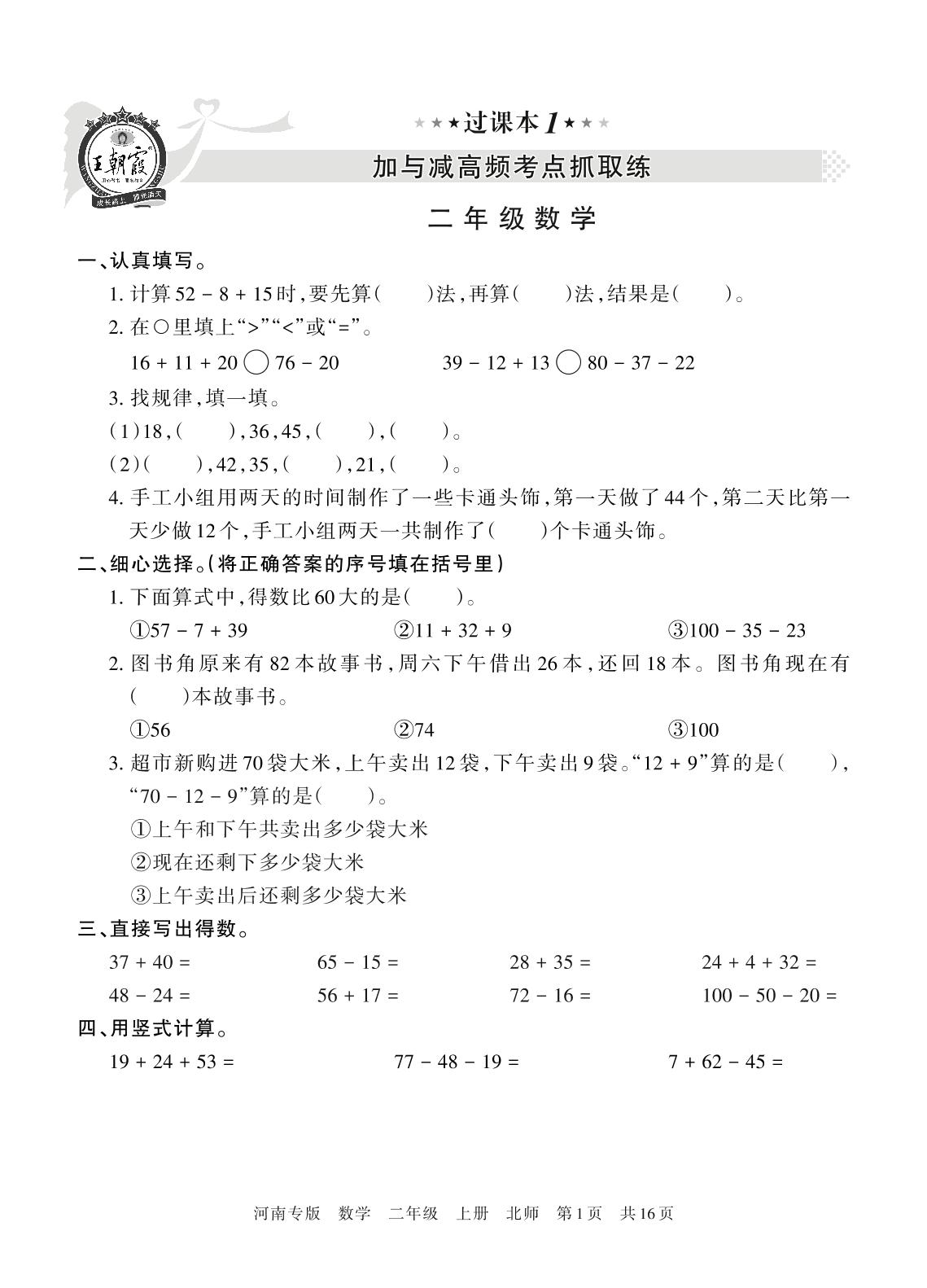 王朝霞期末过课本——加与减高频考点抓取练二年级上册数学(北师版)_R211129091448546【1】