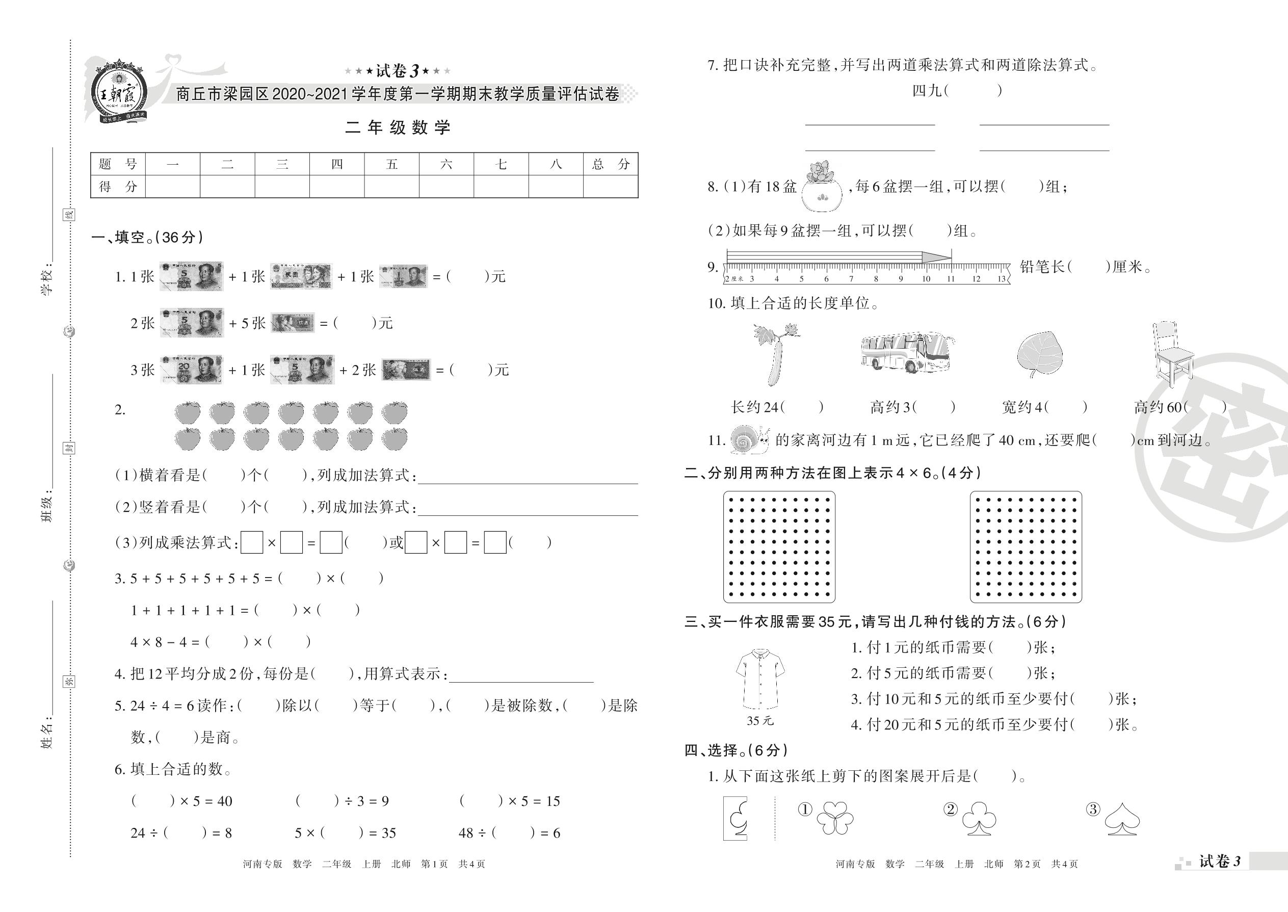 商丘市梁园区2020~2021学年度第一学期期末教学质量评估试卷二年级数学(北师版)【3】