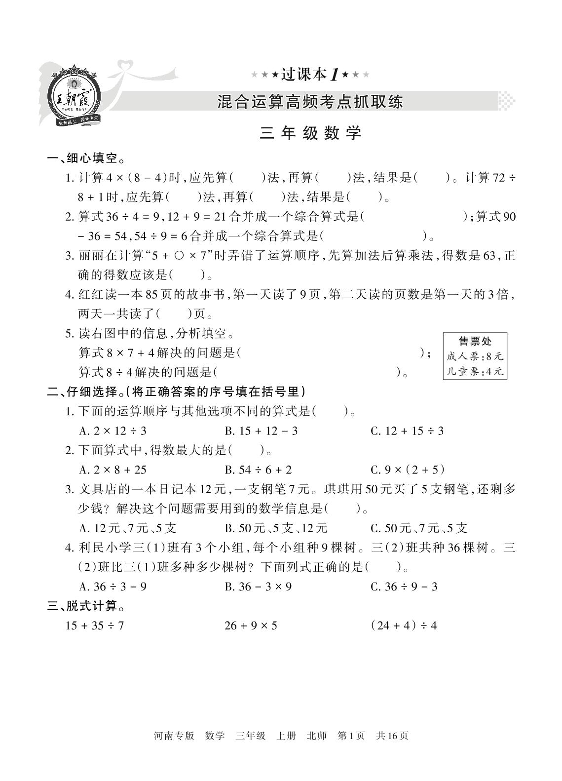 王朝霞期末过课本——混合运算高频考点抓取练三年级上册数学(北师版)_R211129091851612【1】