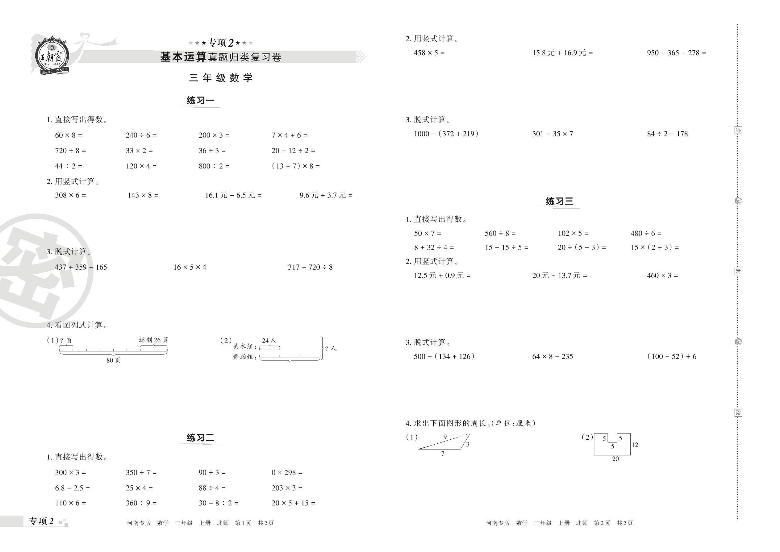 王朝霞期末专项卷——基本运算真题归类复习卷三年级上册数学(北师版)_R211129091851336【2】