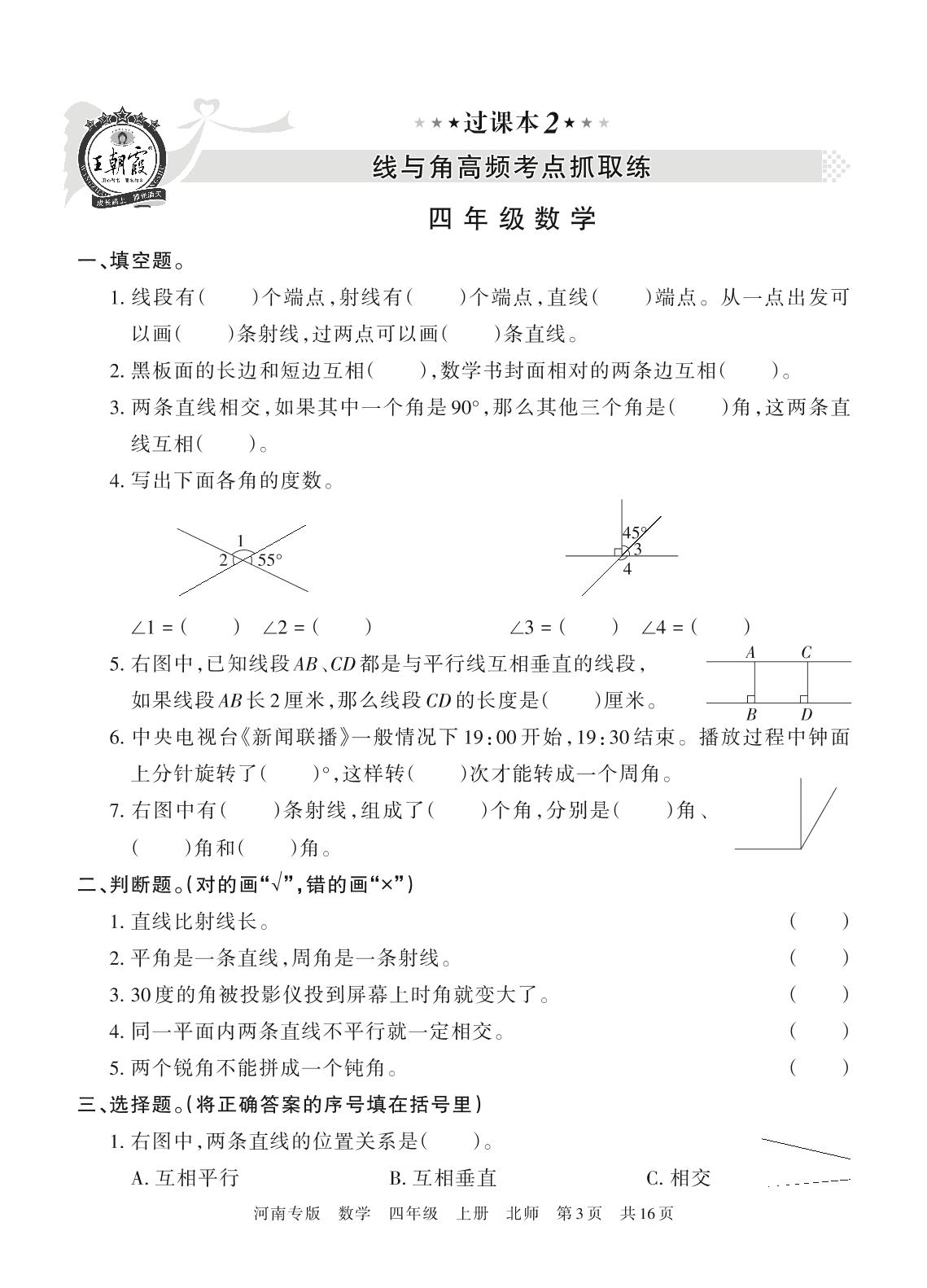 王朝霞期末过课本——线与角高频考点抓取练四年级上册数学(北师版)_R211129092244248【2】