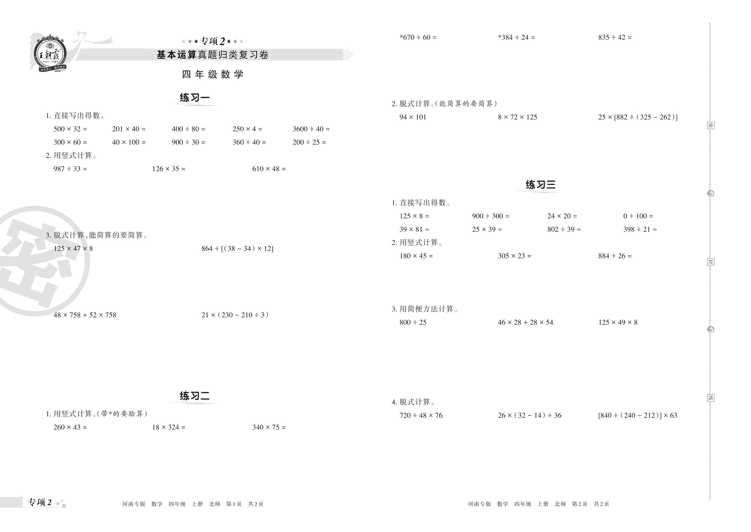 王朝霞期末专项卷——基本运算真题归类复习卷四年级上册数学(北师版)_R211129092244130【2】