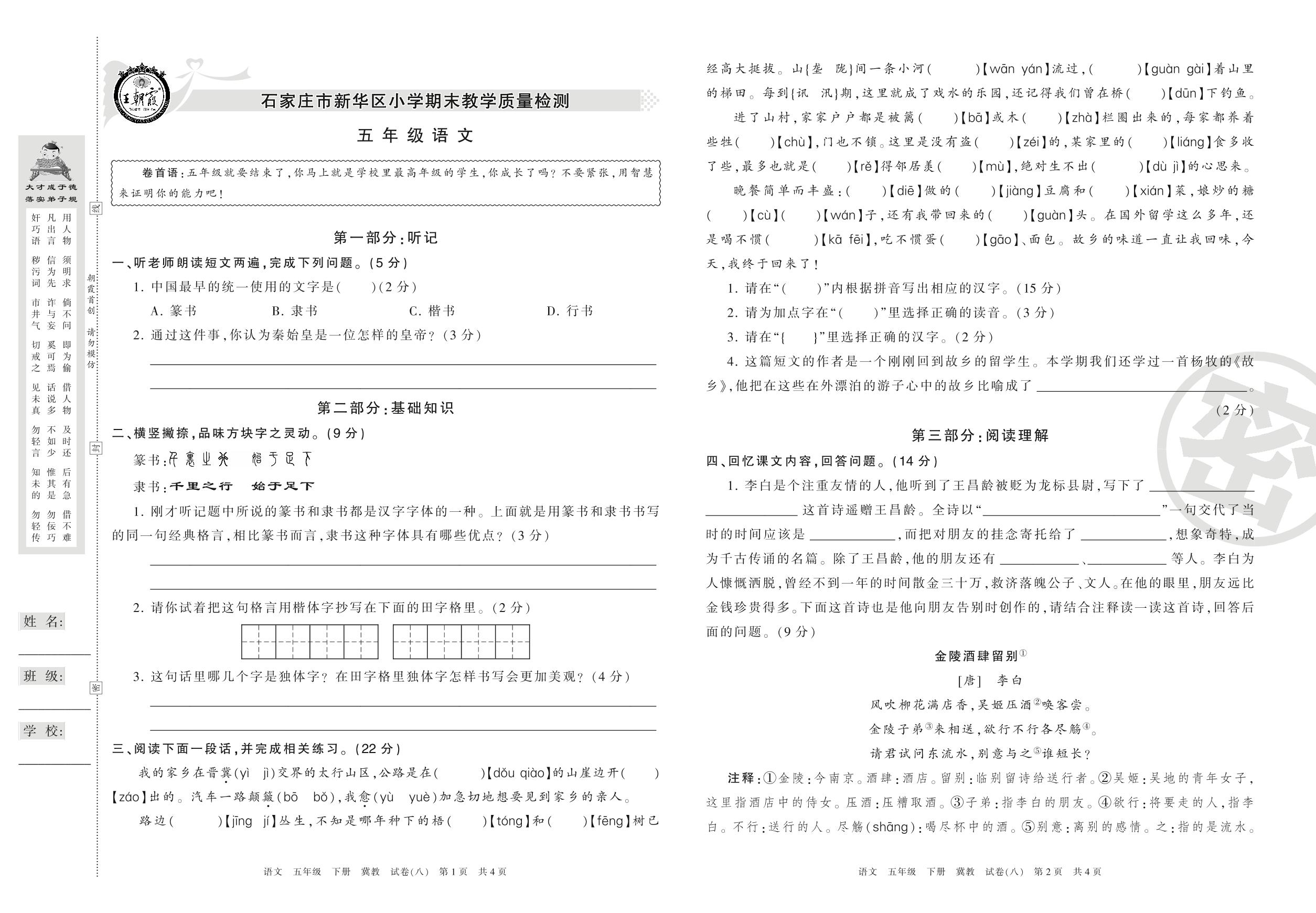 2015-2016学年第二学期石家庄市新华区五年级语文试卷(冀教版)【8】