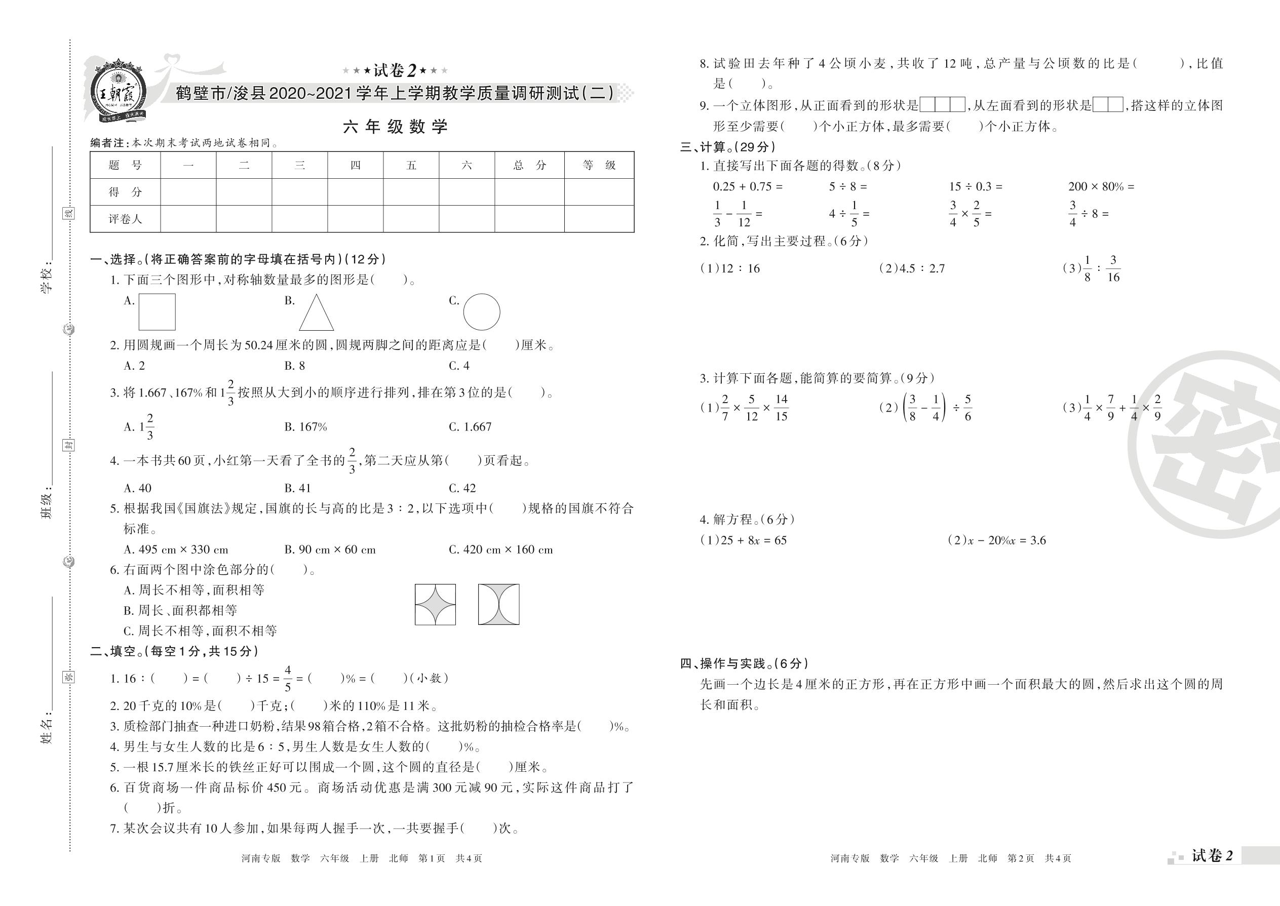 鹤壁市、浚县2020~2021学年上学期教学质量调研测试(二)六年级数学(北师版)【2】