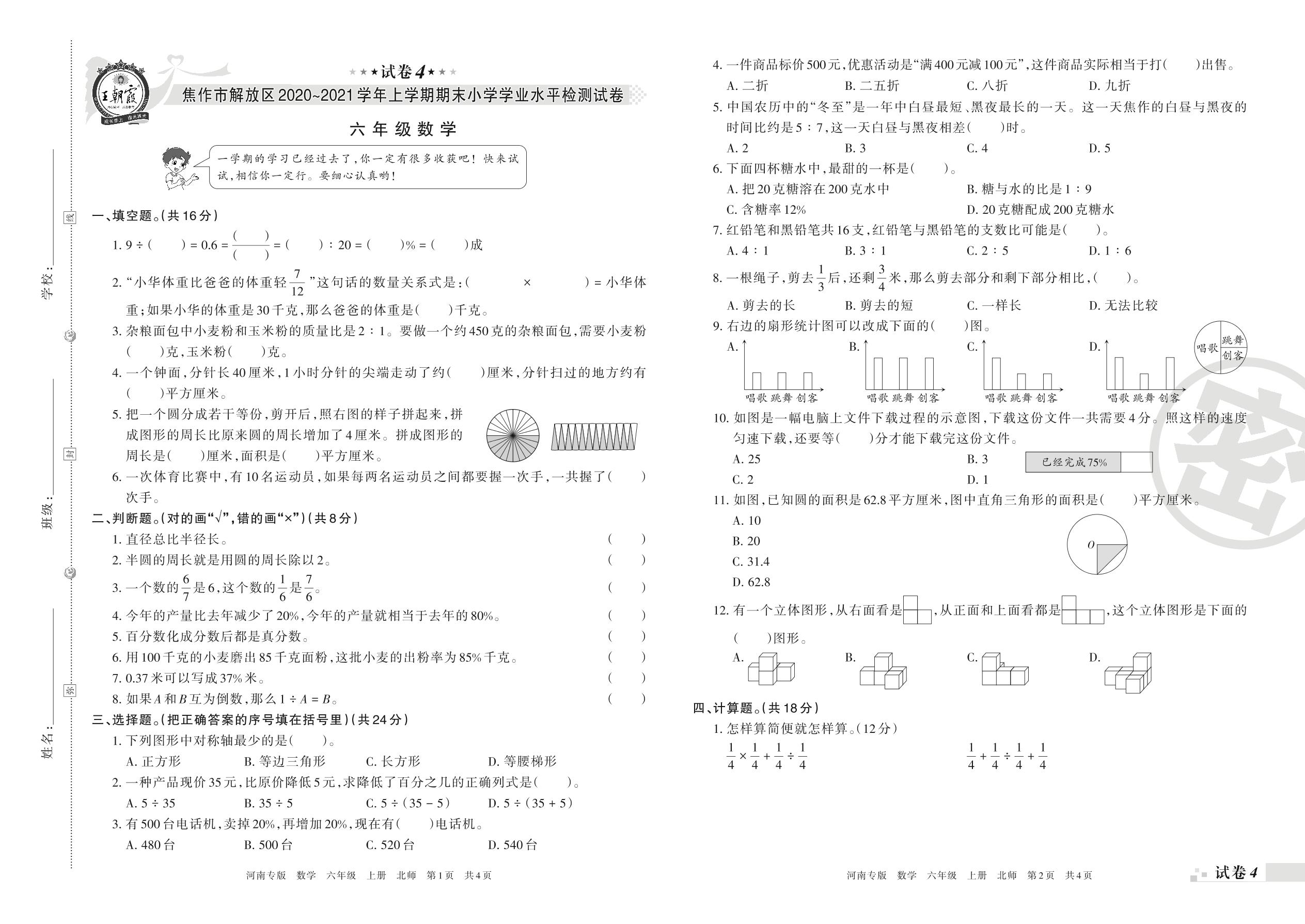 焦作市解放区2020~2021学年上学期期末小学学业水平检测试卷六年级数学(北师版)【4】