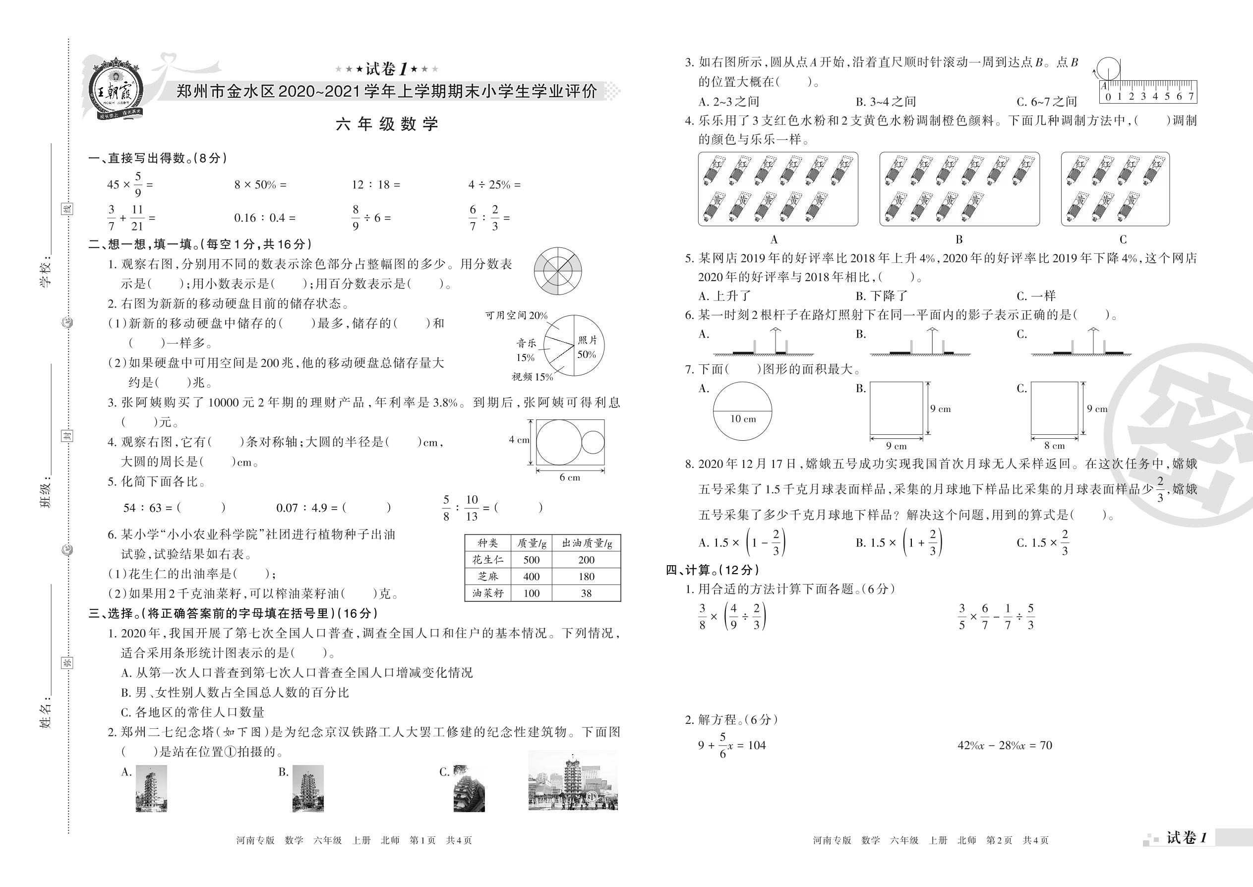 郑州市金水区2020~2021学年上学期期末小学生学业评价六年级数学(北师版)_R211129092616507【1】