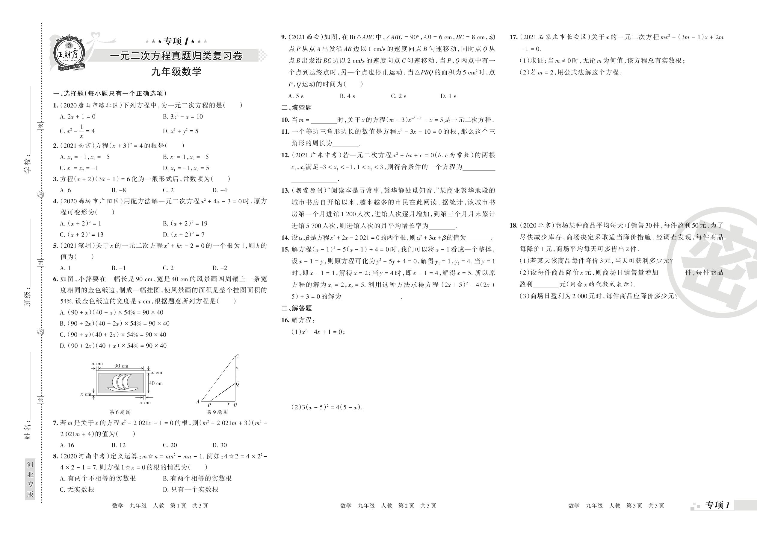 2021-2022学年第一学期王朝霞期末专项卷——一元二次方程真题归类复习卷九年级数学(人教版)【1】