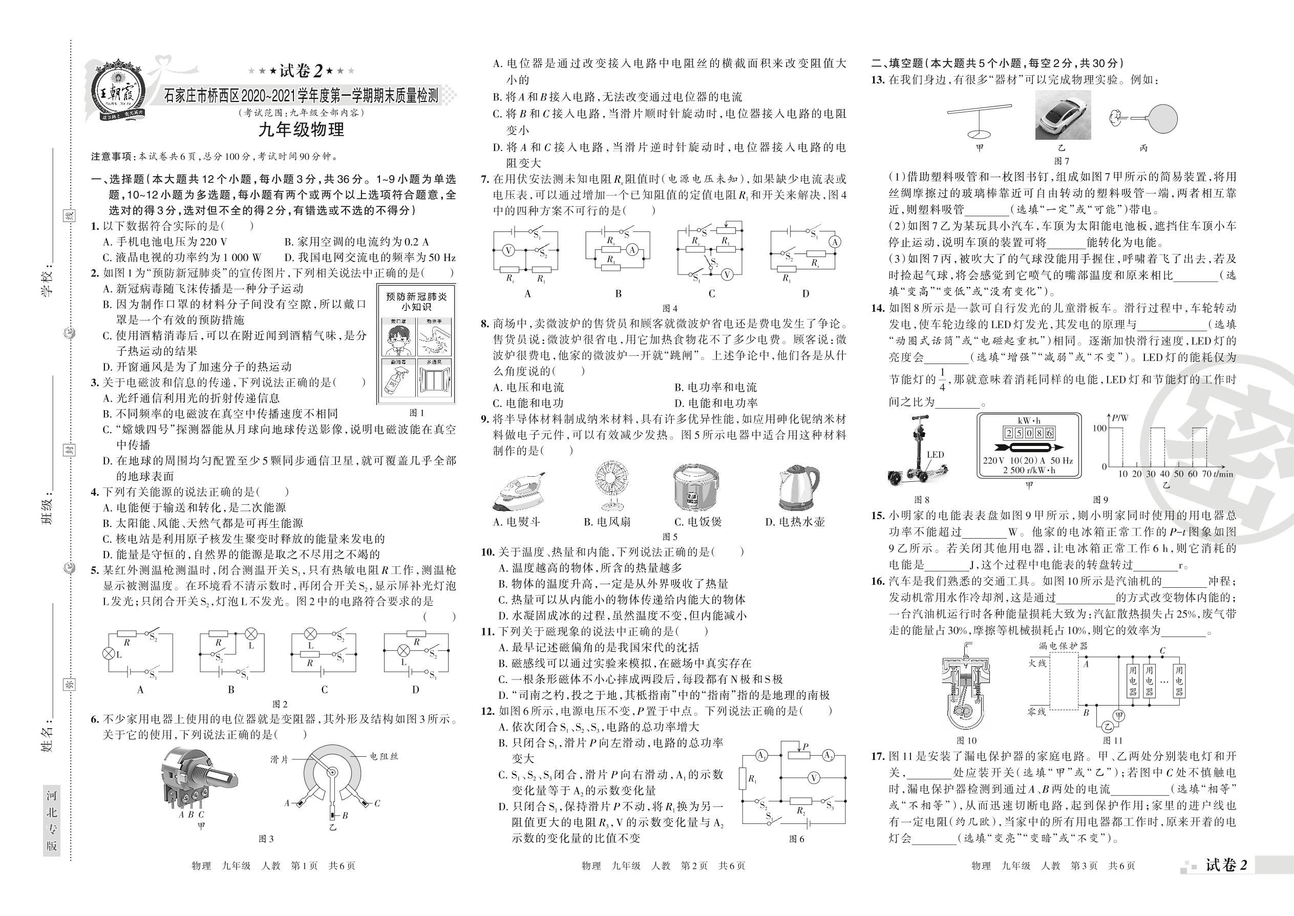 石家庄市桥西区2020~2021学年度第一学期期末质量检测九年级物理(人教版)【2】