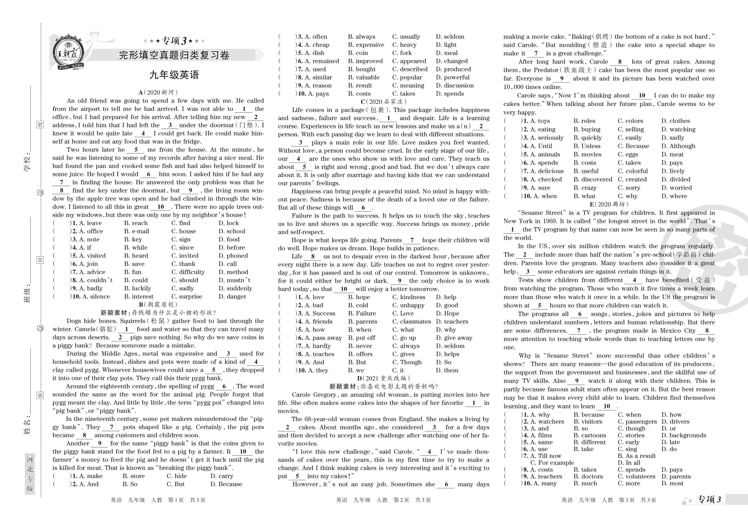 2021-2022学年第一学期王朝霞期末专项卷——完形填空真题归类复习卷九年级英语(人教版)【3】