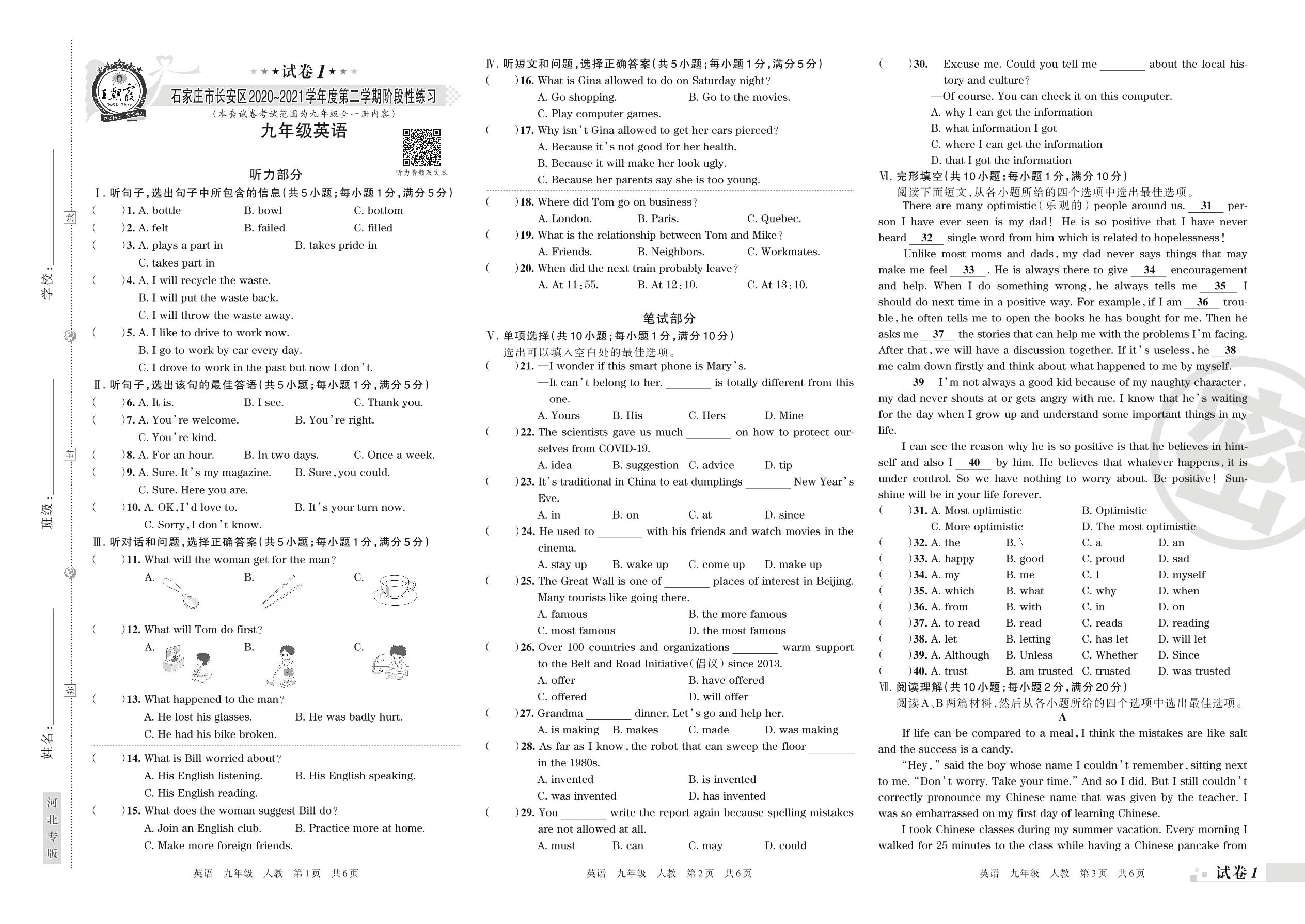 石家庄市长安区2020~2021学年度第二学期阶段性练习九年级英语(人教版)【1】