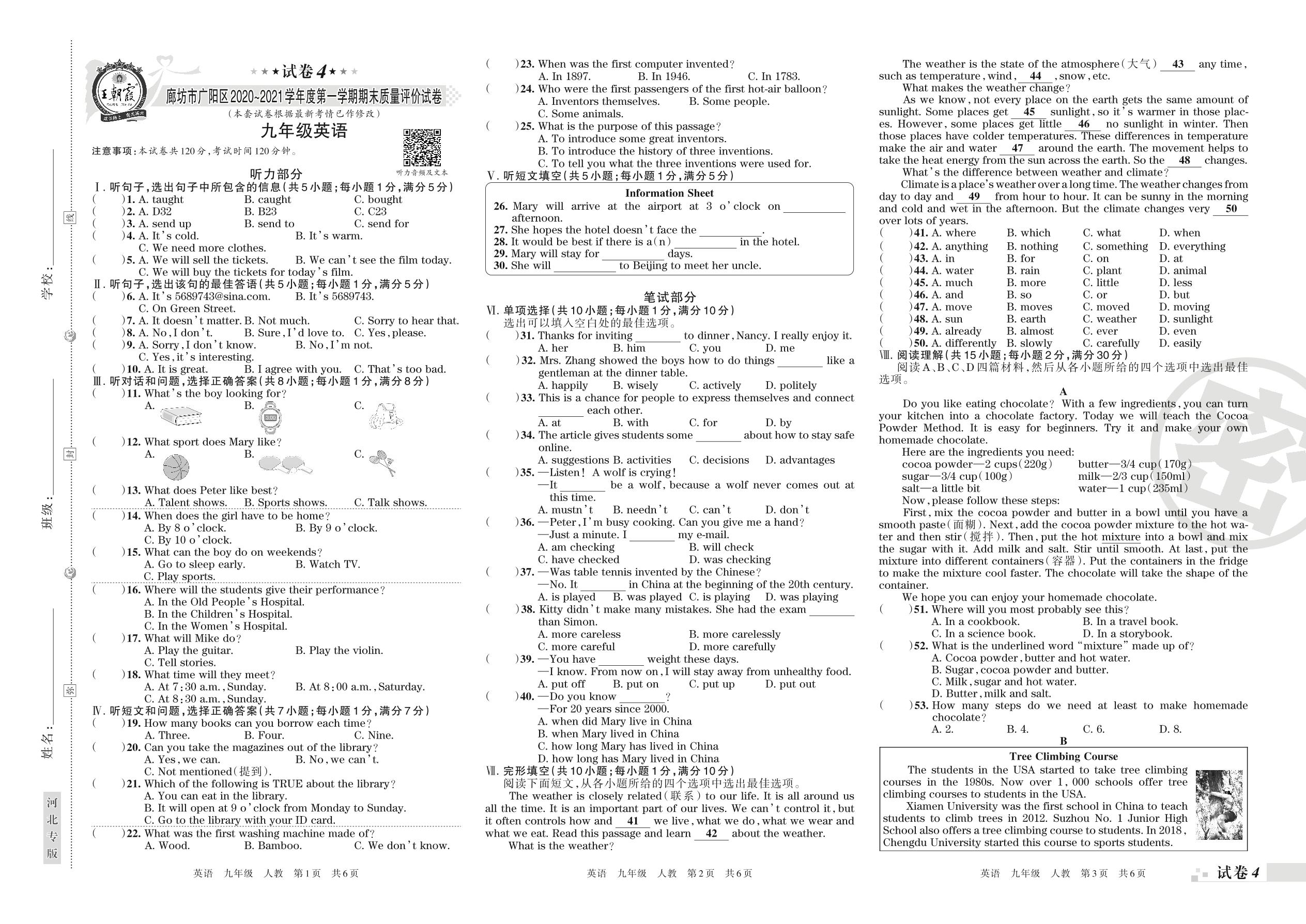 廊坊市广阳区2020~2021学年度第一学期期末质量评价九年级英语(人教版)【4】
