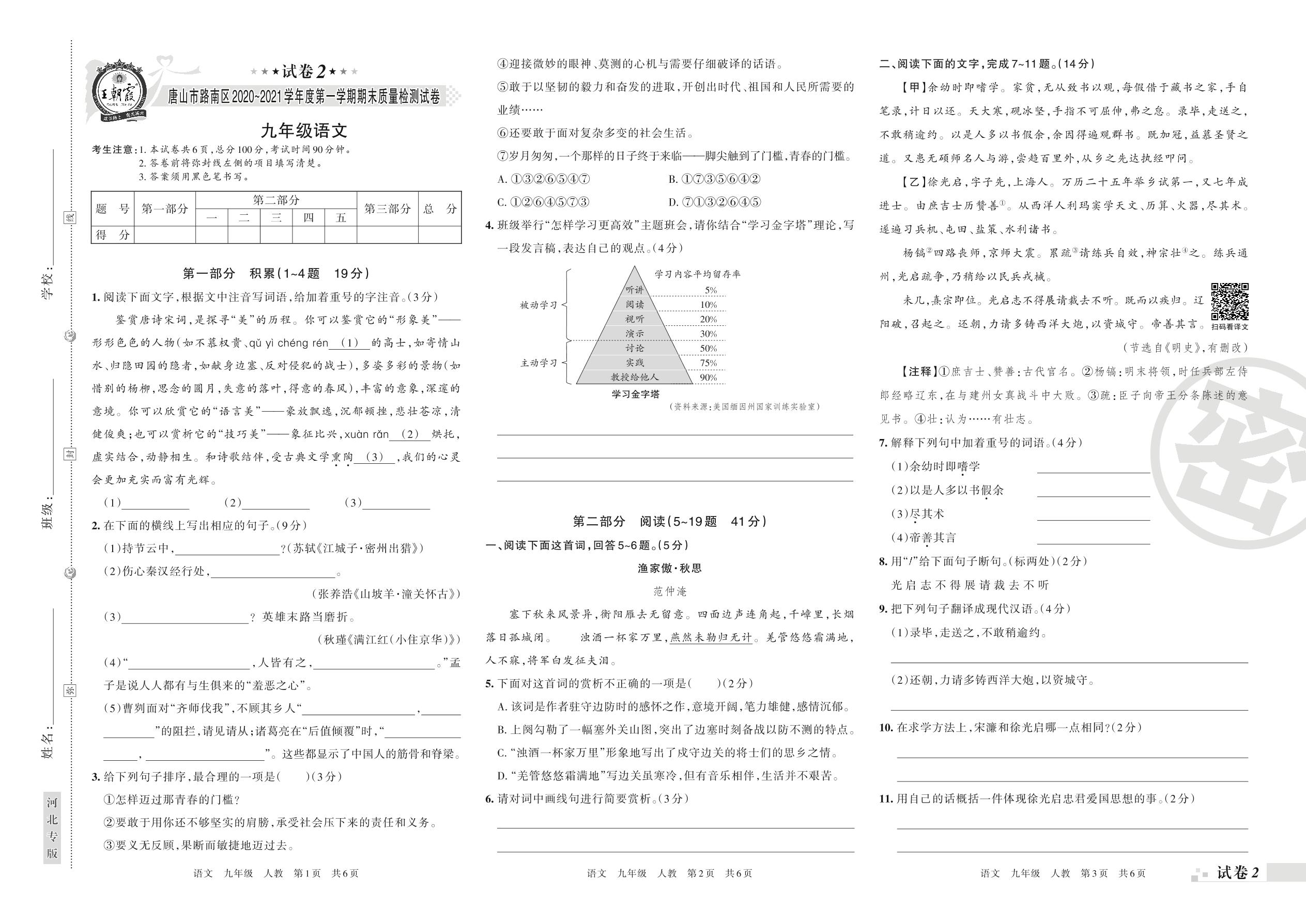 唐山市路南区2020~2021学年度第一学期期末质量检测试卷九年级语文(人教版)【2】