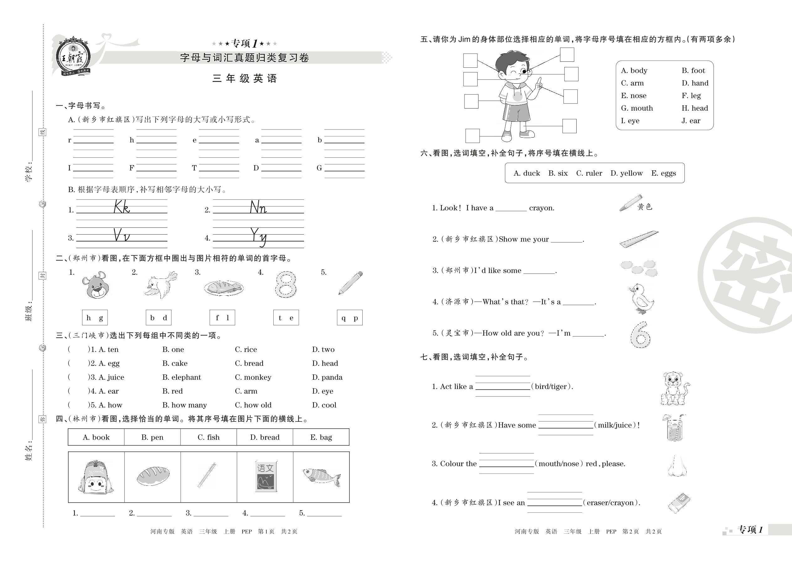 王朝霞期末专项卷——字母与词汇真题归类复习卷三年级上册英语(人教PEP版)_R211130102858474【1】
