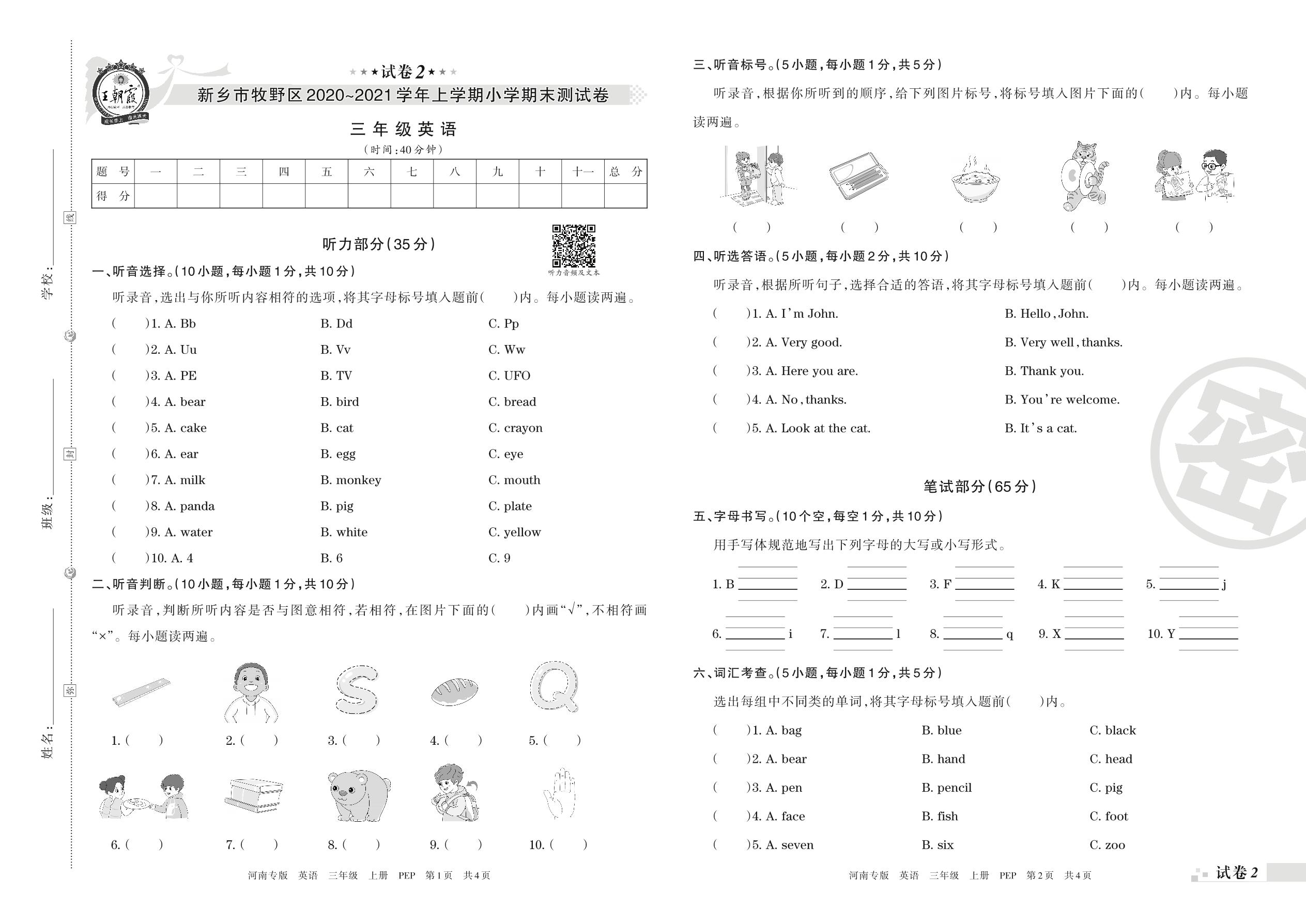 新乡市牧野区2020~2021学年上学期小学期末测试卷三年级英语(人教PEP版)【2】