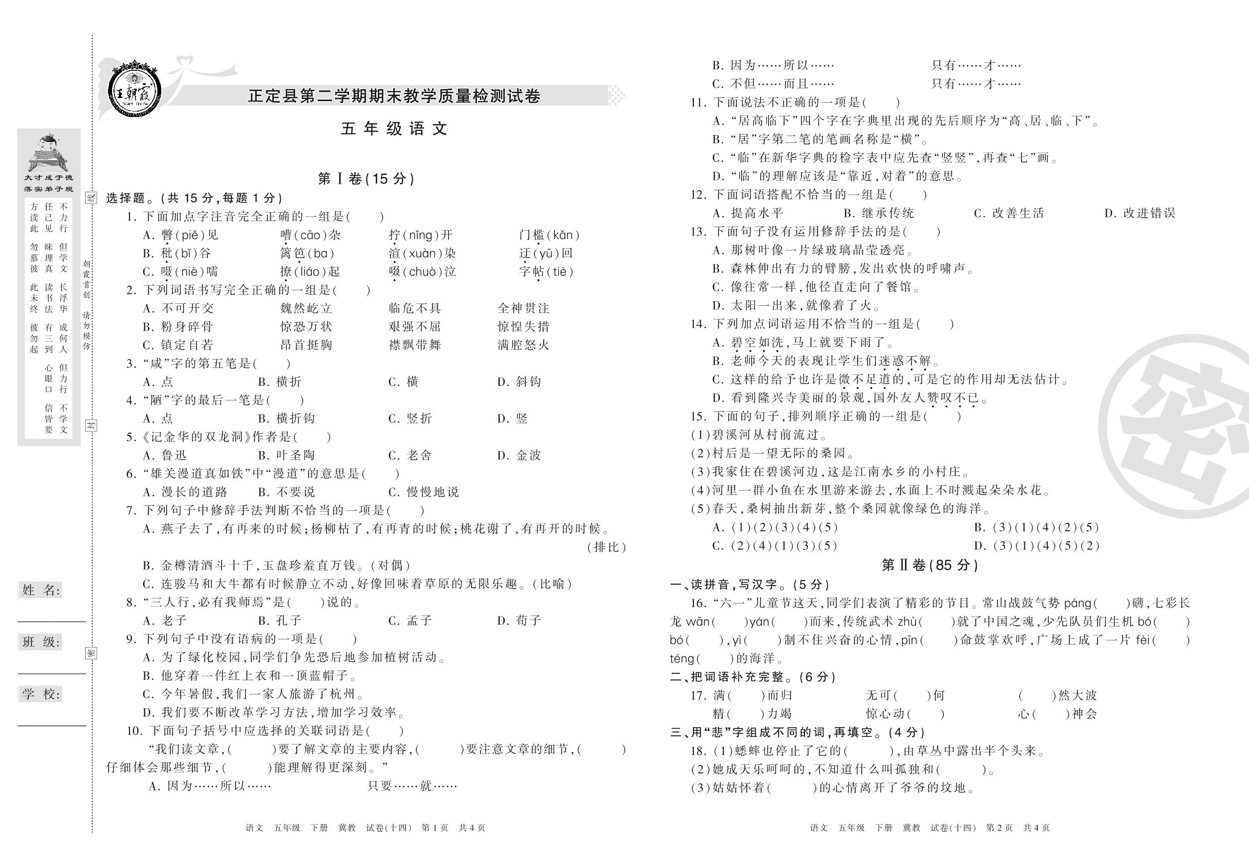 2015-2016学年第二学期石家庄市正定县五年级语文试卷(冀教版)【14】