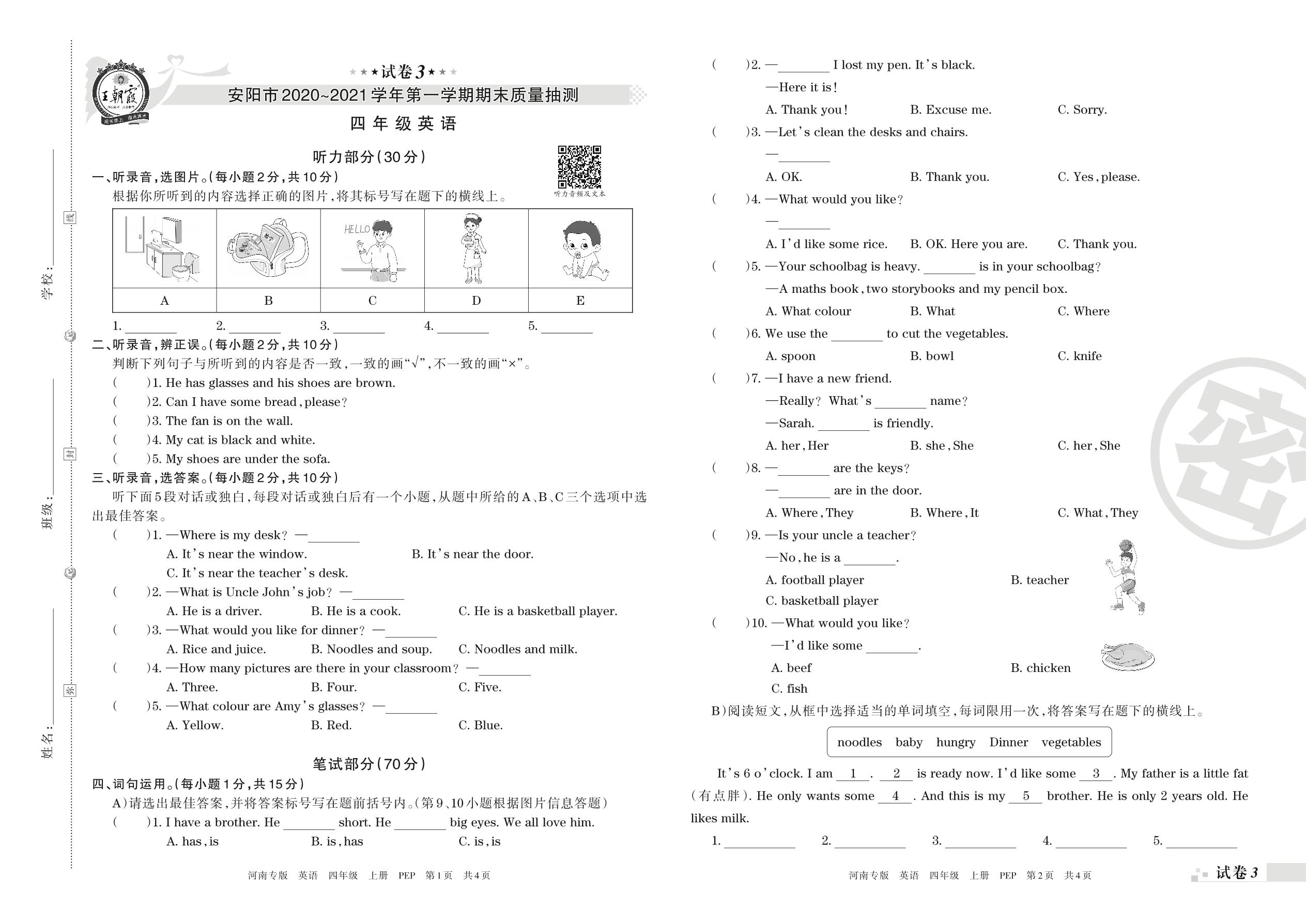 安阳市2020~2021学年第一学期期末质量抽测四年级英语(人教PEP版)【3】