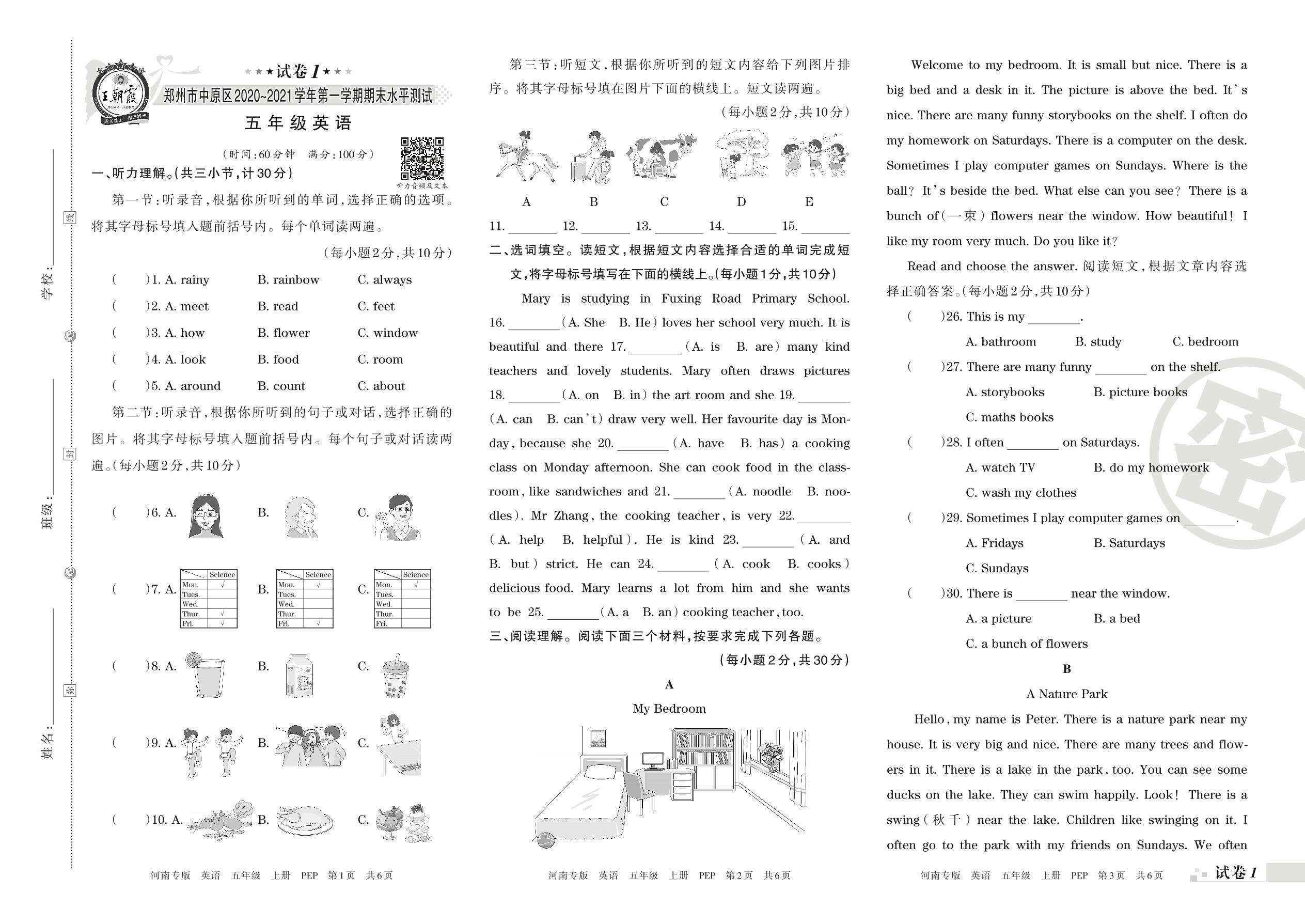 郑州市中原区2020~2021学年第一学期期末水平测试五年级英语(人教PEP版)【1】