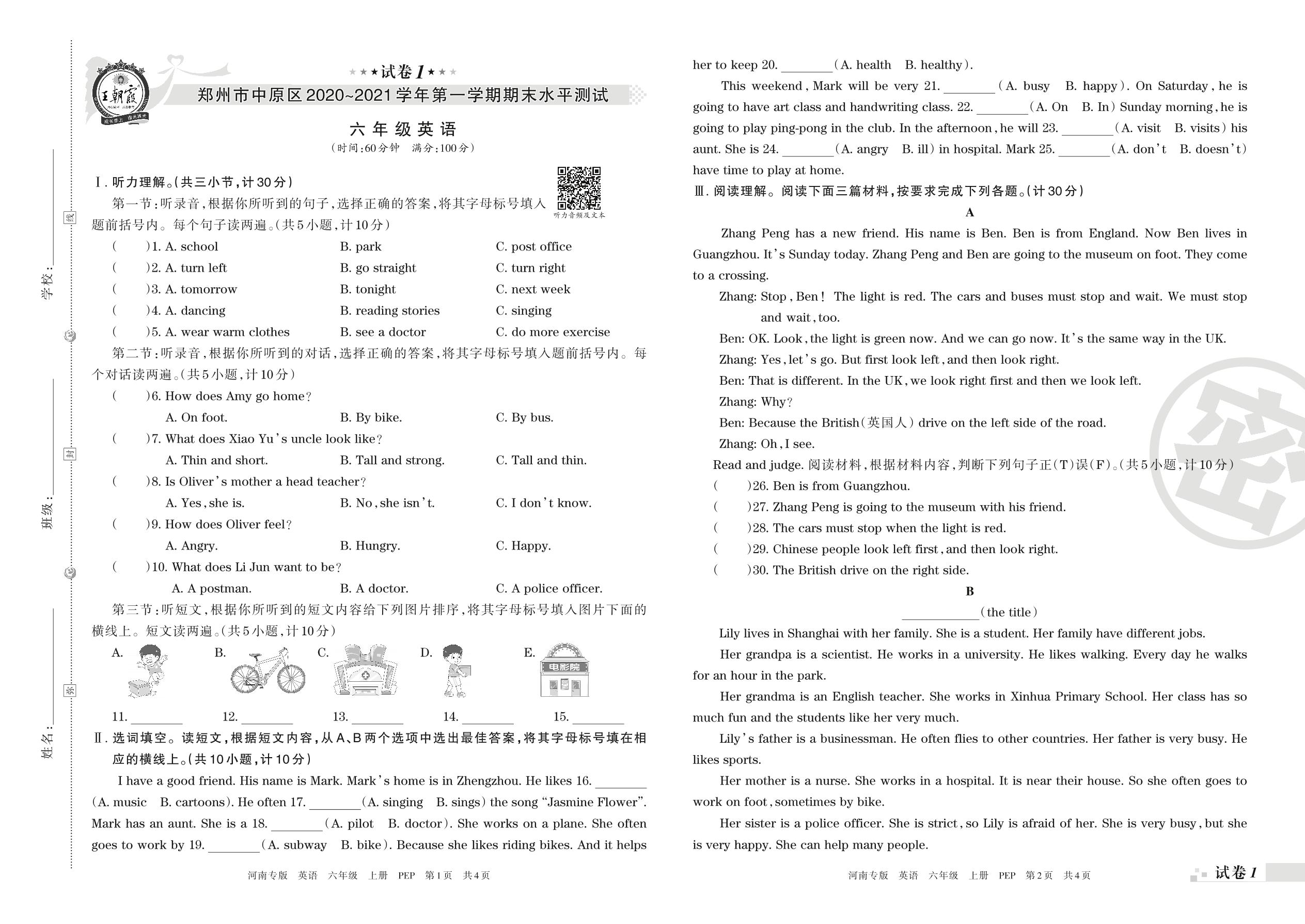 郑州市中原区2020~2021学年第一学期期末水平测试六年级英语(人教PEP版)【1】