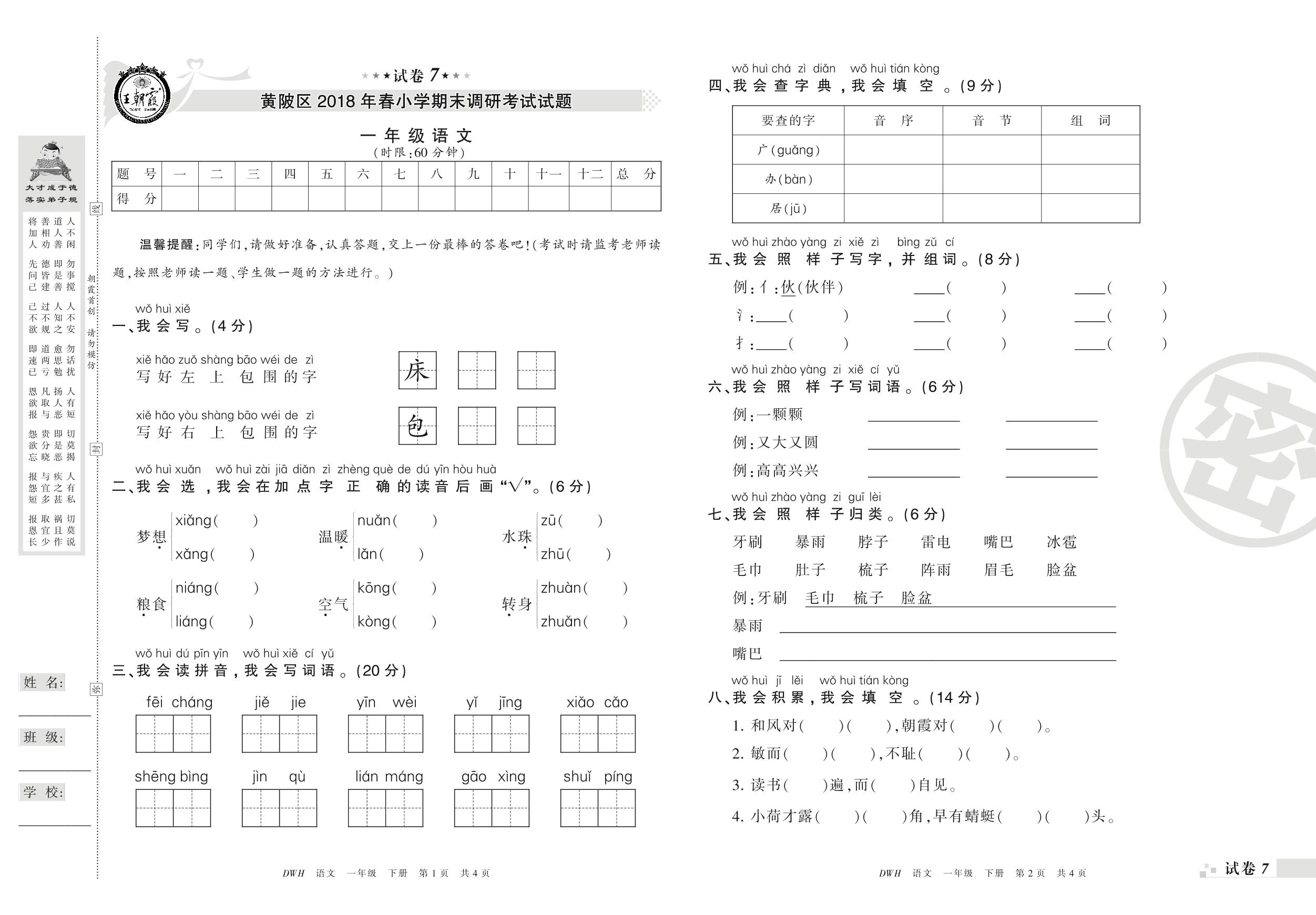 2017-2018学年第二学期武汉市黄陂区一年级语文试卷(人教版)【7】