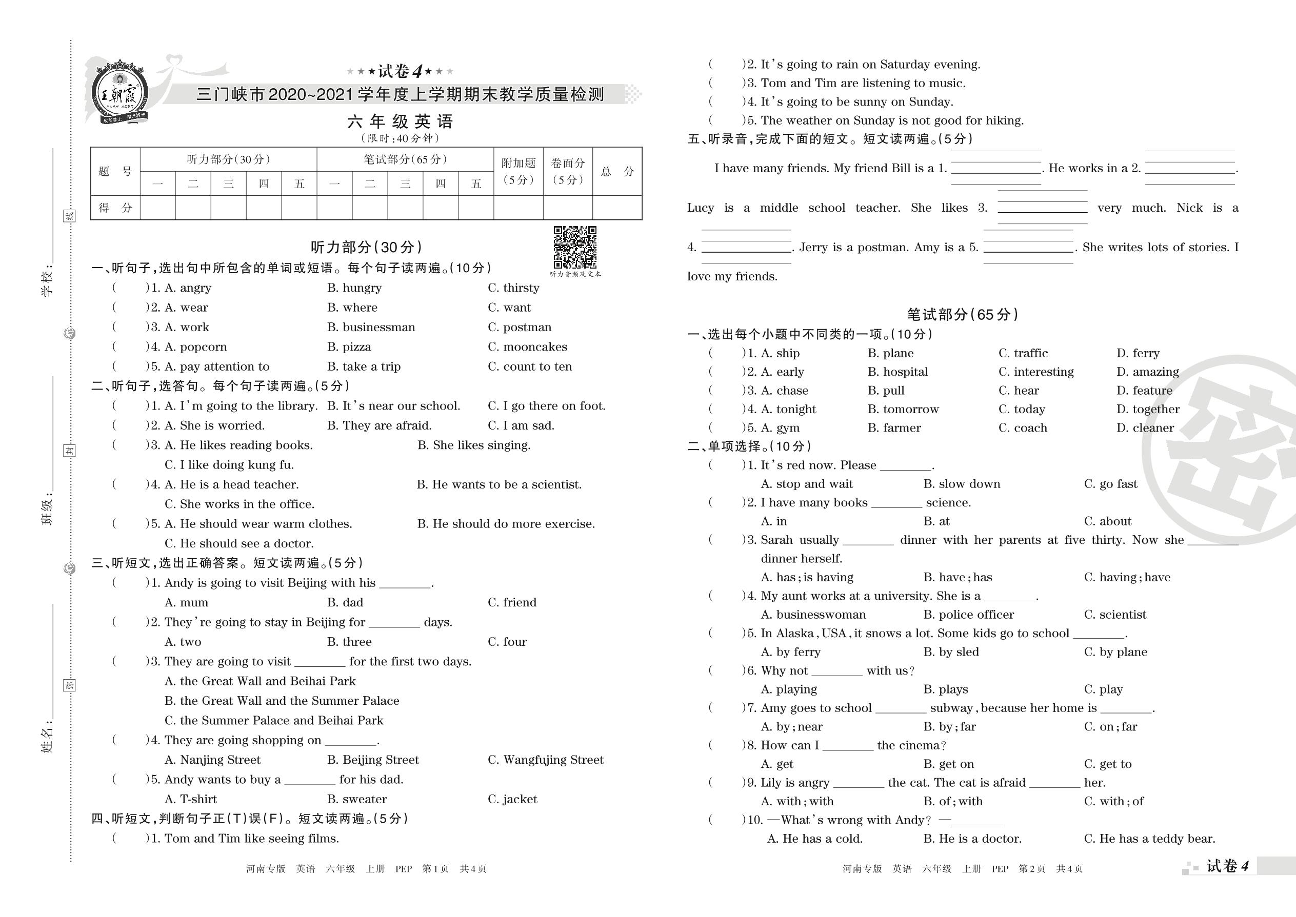 三门峡市2020~2021学年度上学期期末教学质量检测六年级英语(人教PEP版)【4】