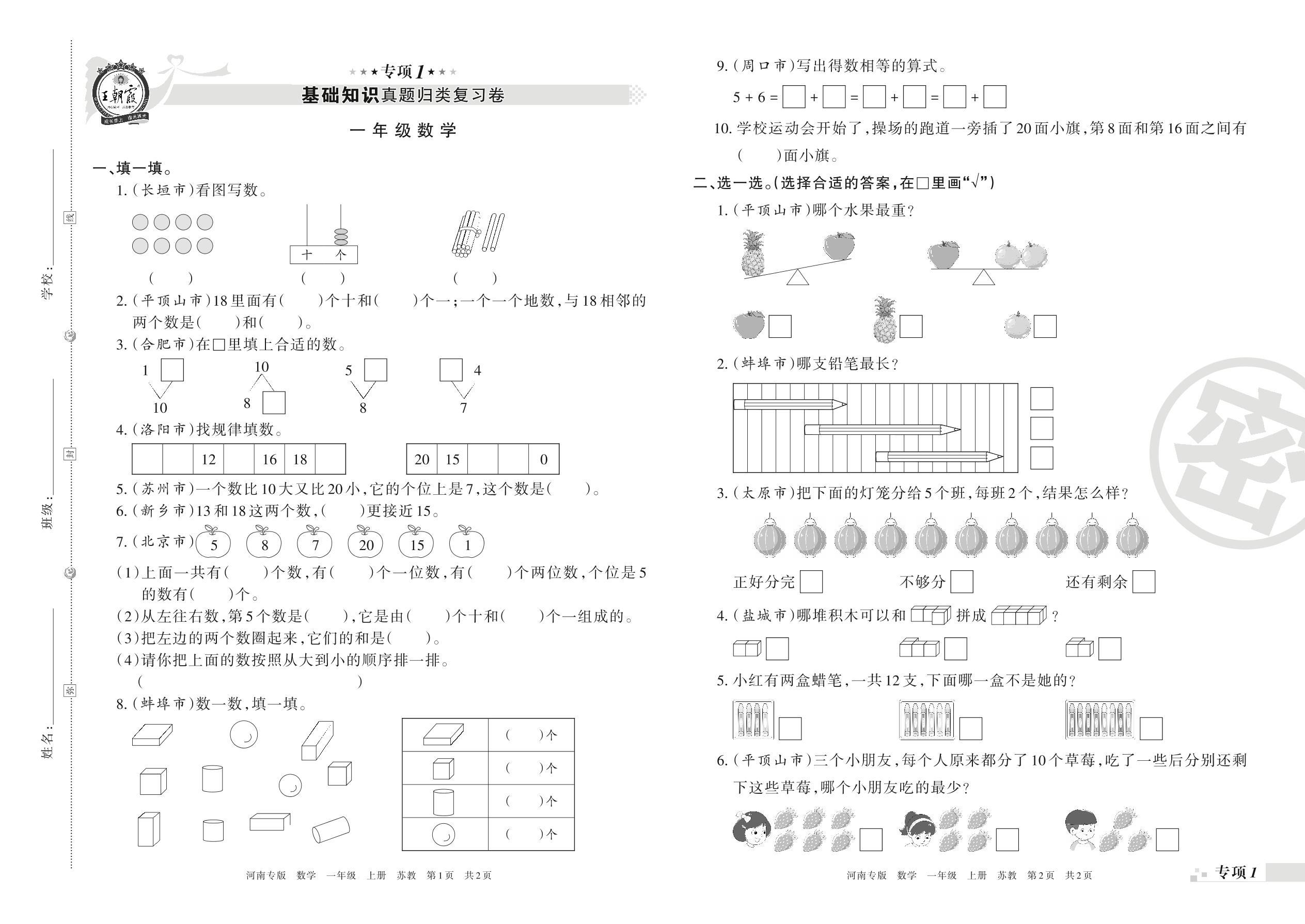 王朝霞期末专项卷——基础知识真题归类复习卷一年级上册数学(苏教版)_R211130110937634【1】