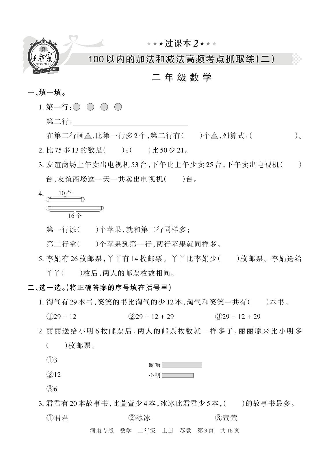 王朝霞期末过课本——100以内的加法和减法高频考点抓取练(二)二年级上册数学(苏教版)_R211130111455569【2】