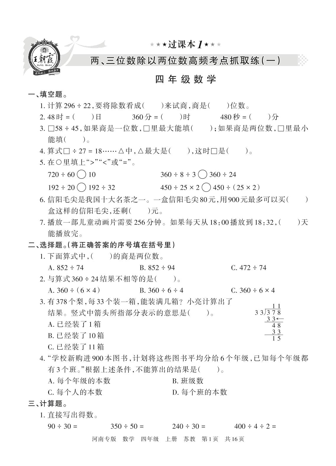 王朝霞期末过课本——两、三位数除以两位数高频考点抓取练(一)四年级上册数学(苏教版)_R211130112211065【1】