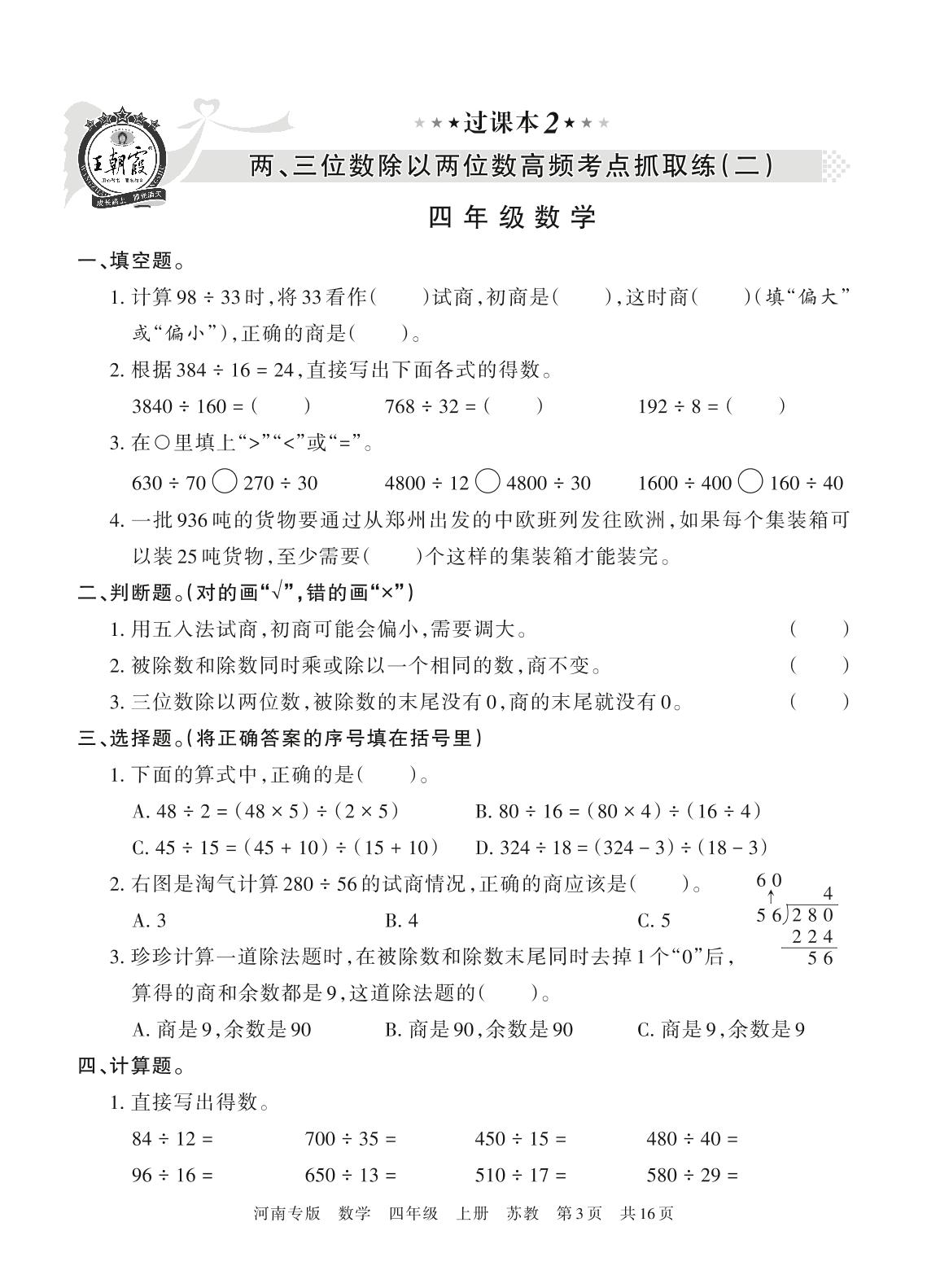 王朝霞期末过课本——两、三位数除以两位数高频考点抓取练(二)四年级上册数学(苏教版)_R211130112211989【2】