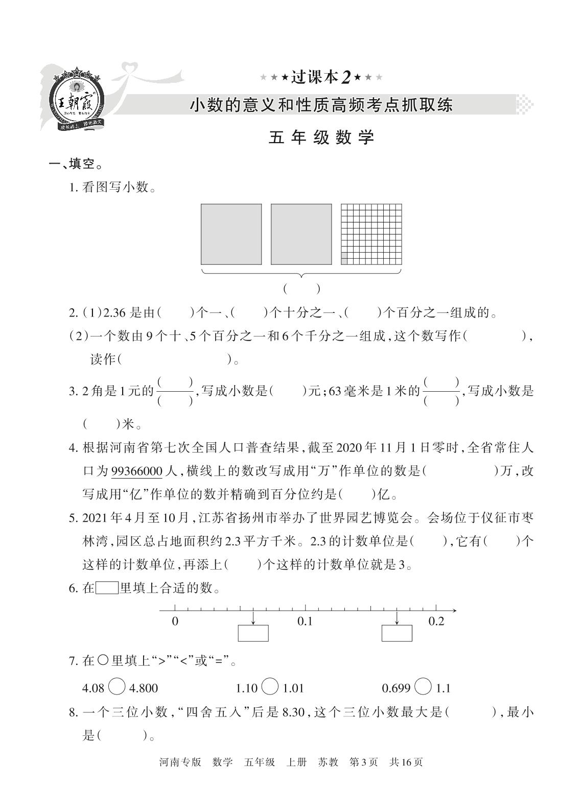 王朝霞期末过课本——小数的意义和性质高频考点抓取练五年级上册数学(苏教版)_R211130112522358【2】