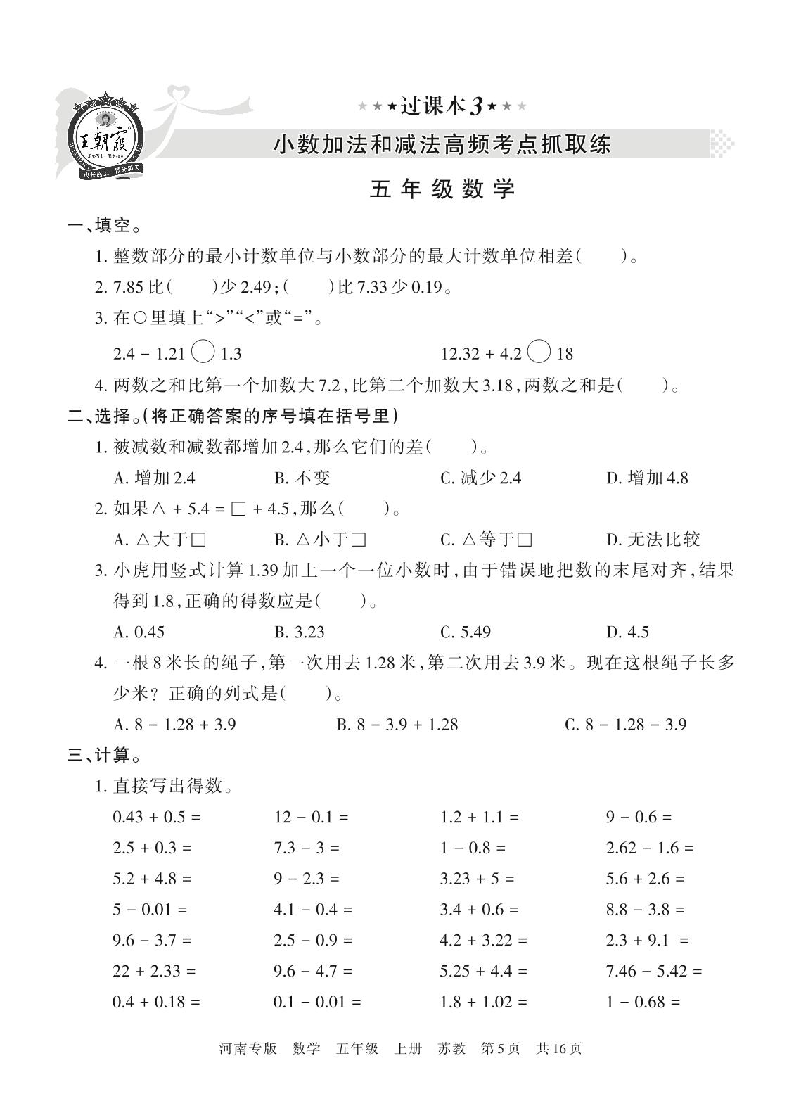 王朝霞期末过课本——小数加法和减法高频考点抓取练五年级上册数学(苏教版)_R211130112523370【3】
