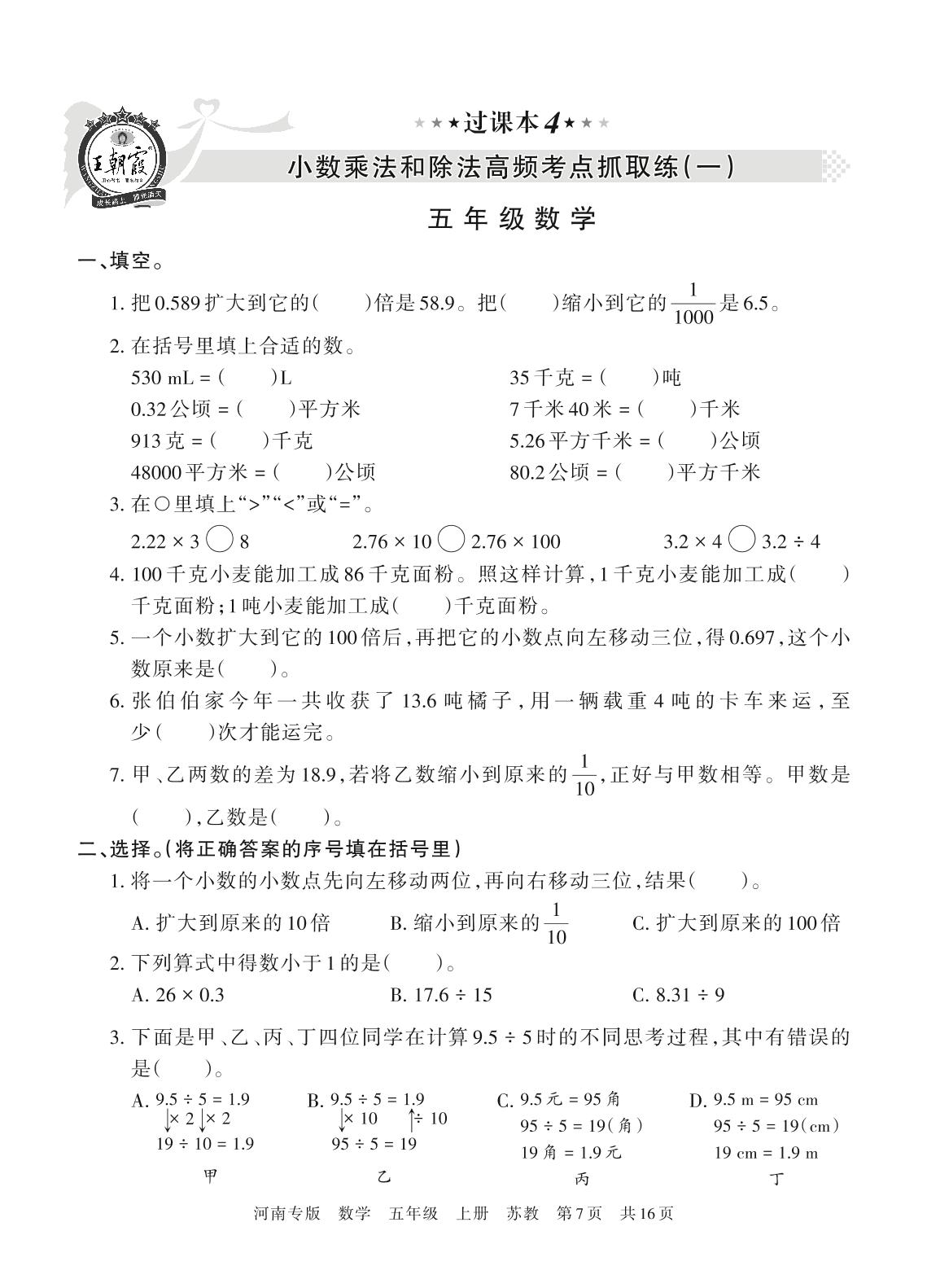 王朝霞期末过课本——小数乘法和除法高频考点抓取练(一)五年级上册数学(苏教版)_R211130112523186【4】