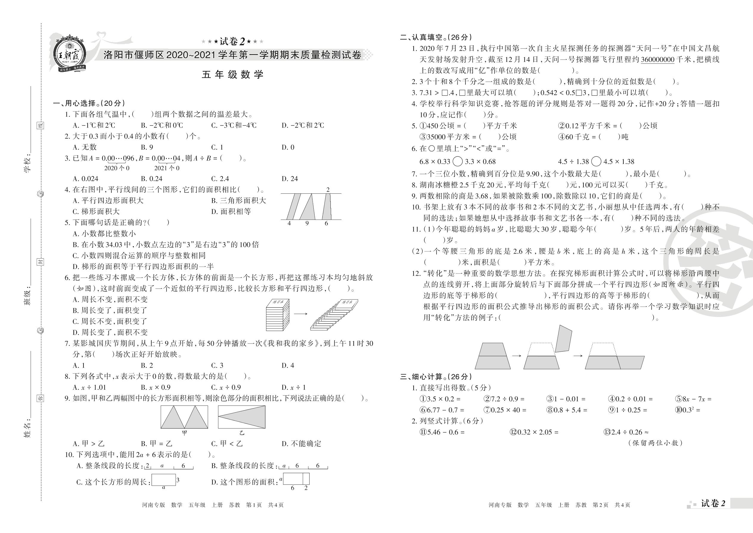 洛阳市偃师区2020~2021学年第一学期期末质量检测试卷五年级数学(苏教版)【2】