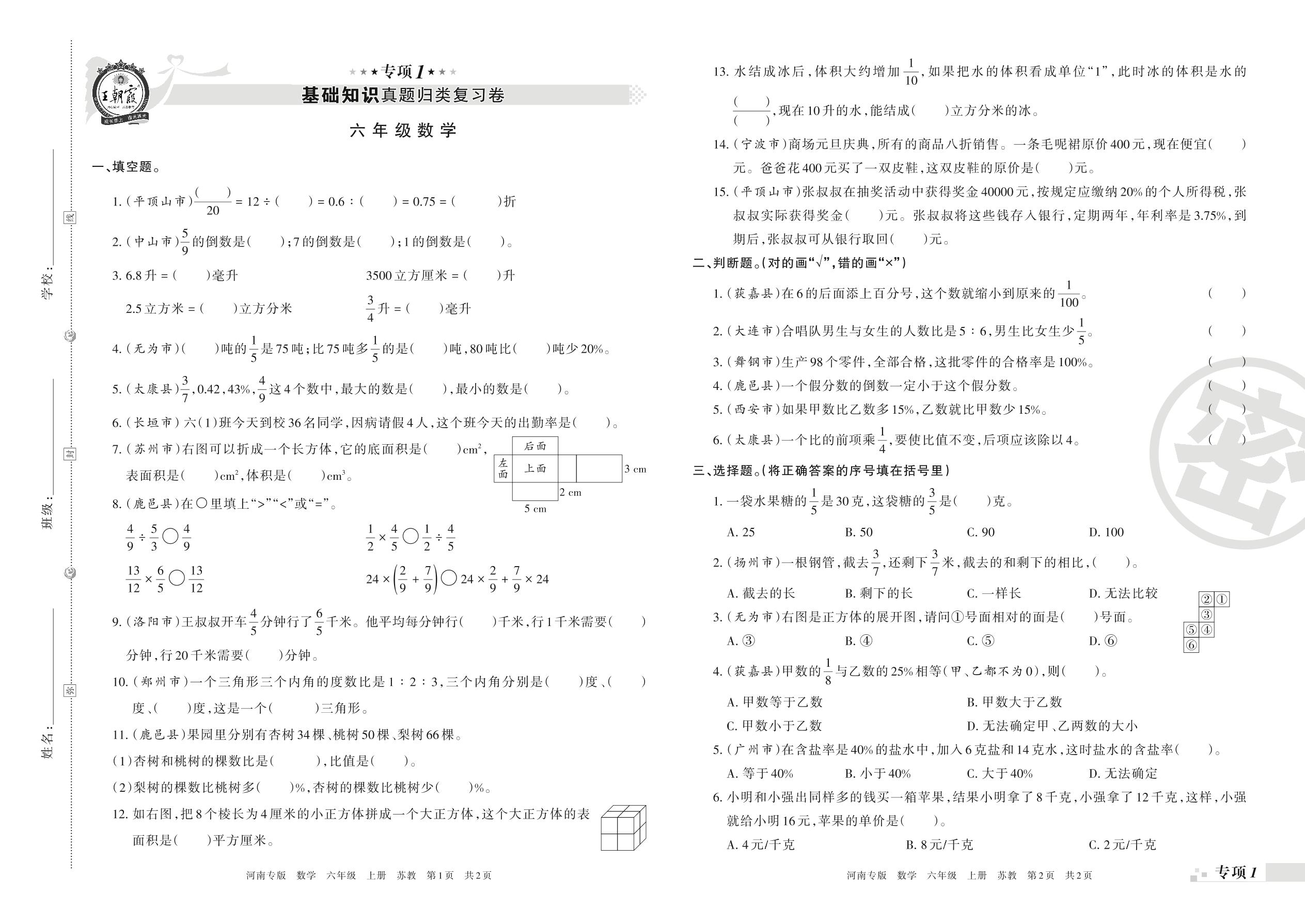 王朝霞期末专项卷——基础知识真题归类复习卷六年级上册数学(苏教版)_R211130112901638【1】