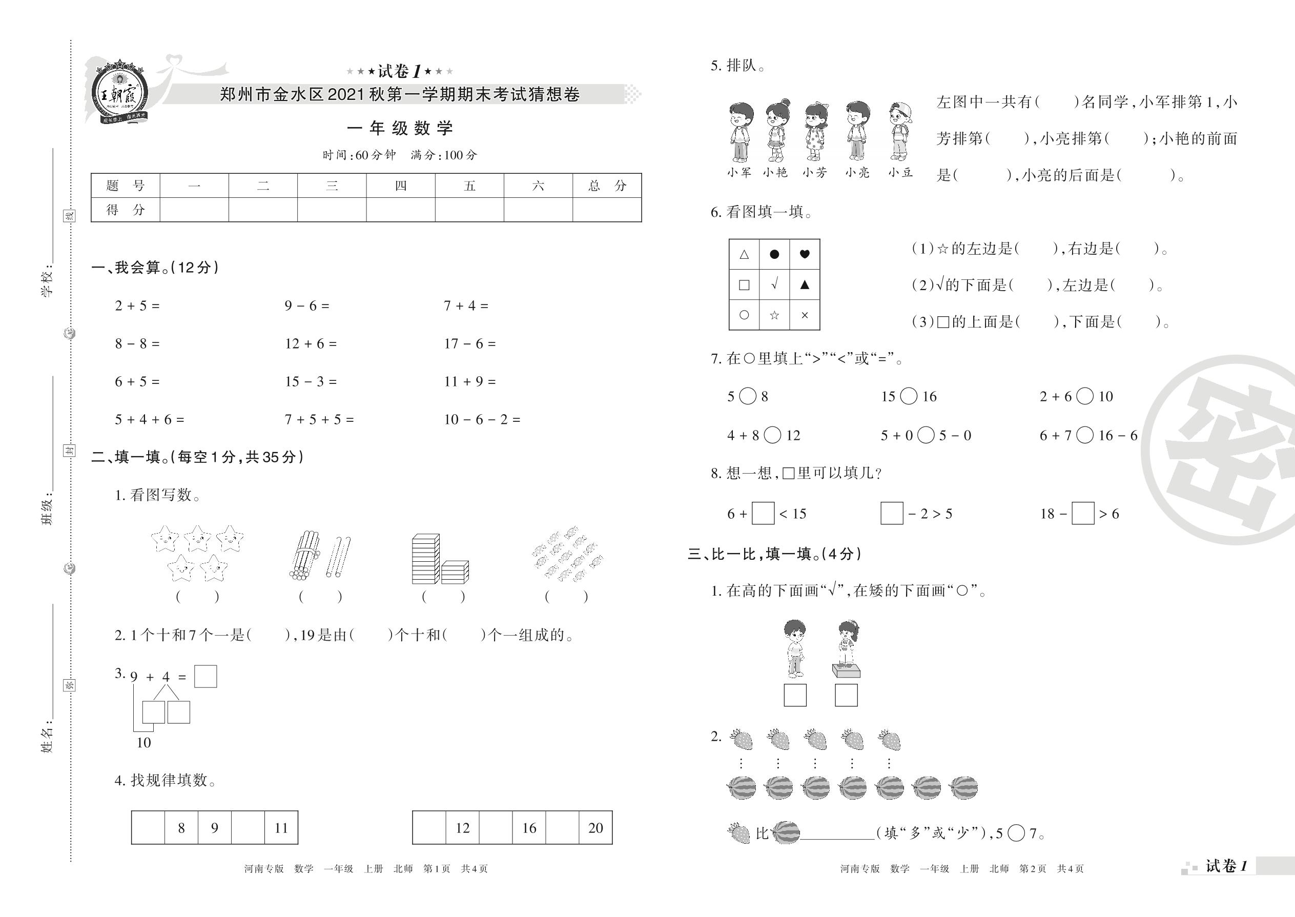郑州市金水区2021秋第一学期期末考试猜想卷一年级数学(北师版)_R211130134903604【1】