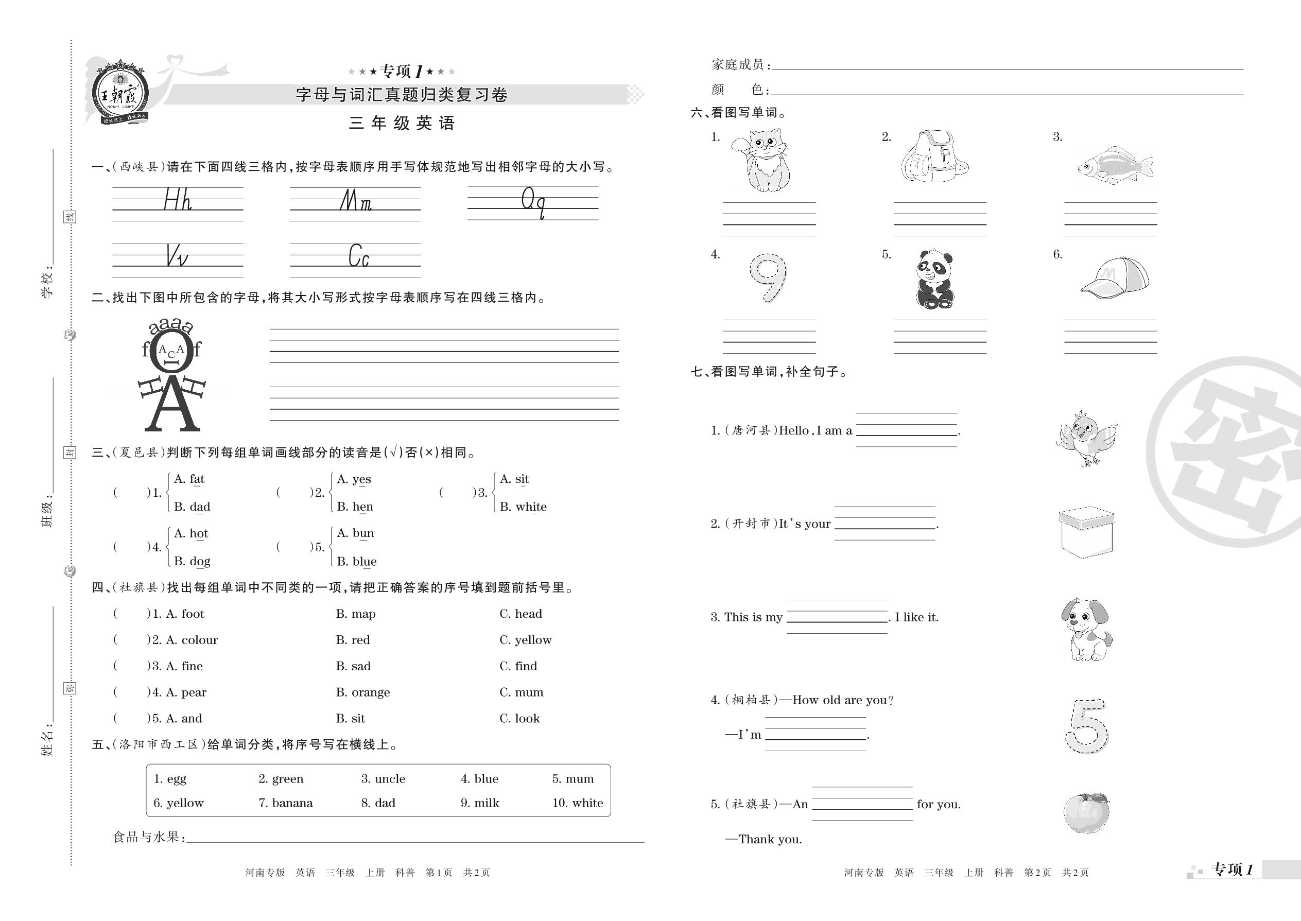 王朝霞期末专项卷——字母与词汇真题归类复习卷三年级上册英语(科普版)_R211130135812909【1】