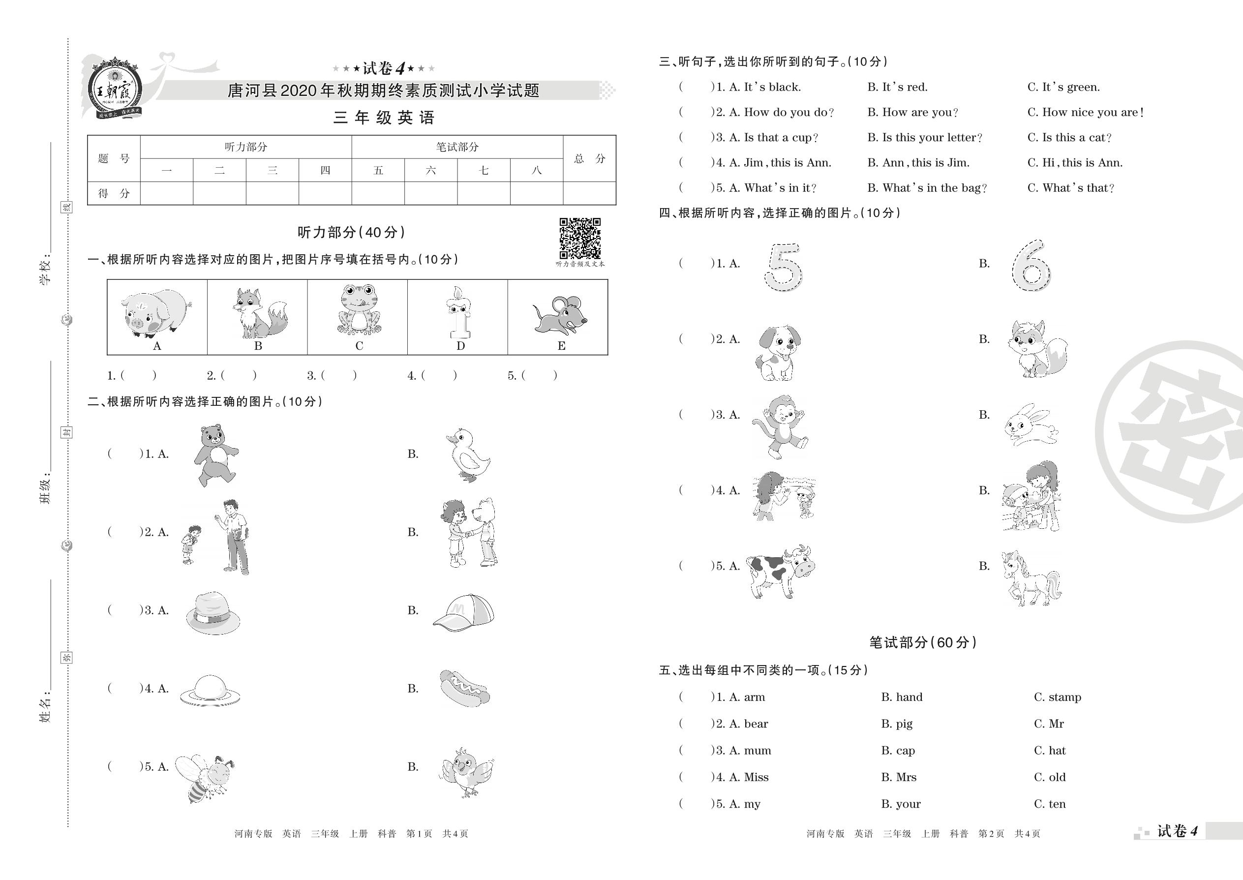 唐河县2020年秋期期终素质测试小学试题三年级英语(科普版)【4】